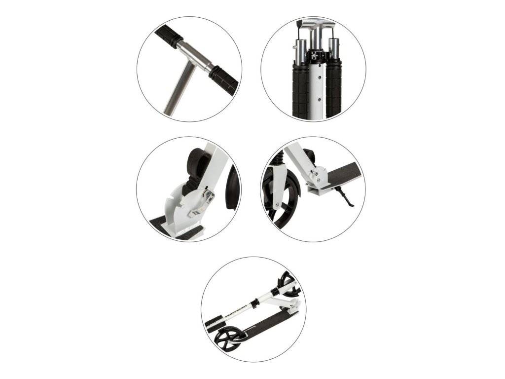 - Praktický systém skladania riadidiel - umožňuje rýchle zloženie kolobežky do kompaktnej veľkosti. Stabilné závesy i zabezpečenie zvýšenie bezpečnosti.