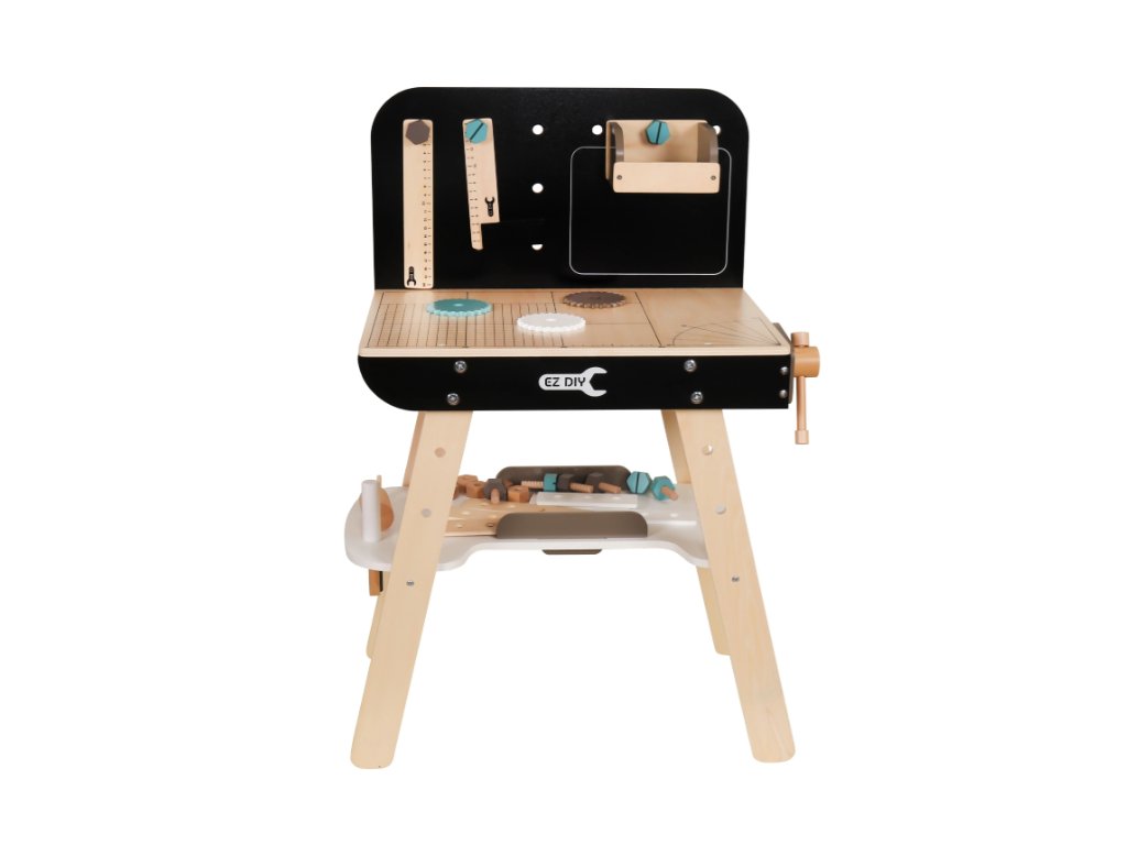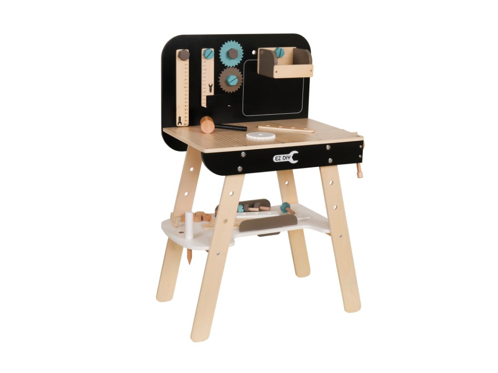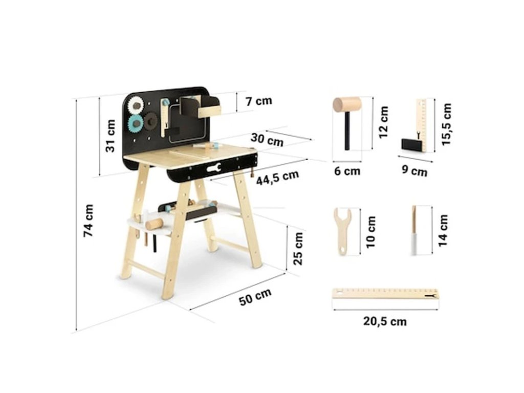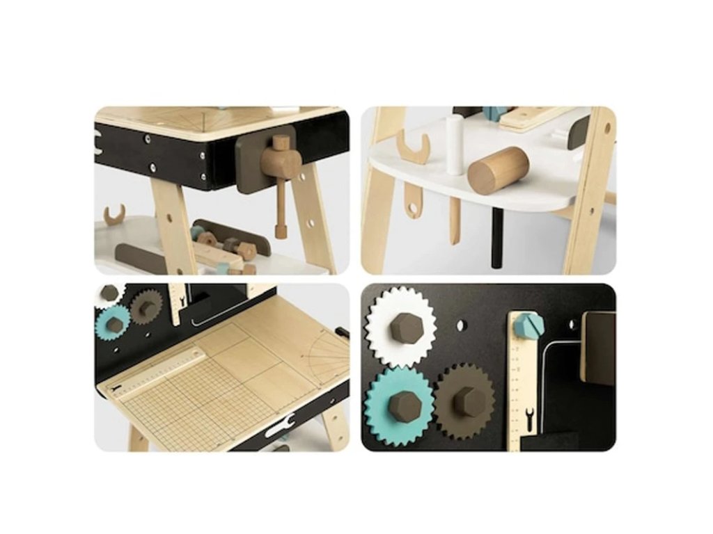Pracovný stôl vybavený 8 rôznymi dielmi, ktorý je špeciálne navrhnutý pre deti, ktoré sú nadšené pre kutilstvo. Sada sa skladá z dielikov ako kladivo, skrutkovač, pravítko, kľúč, zverák, uholník, píla a police.