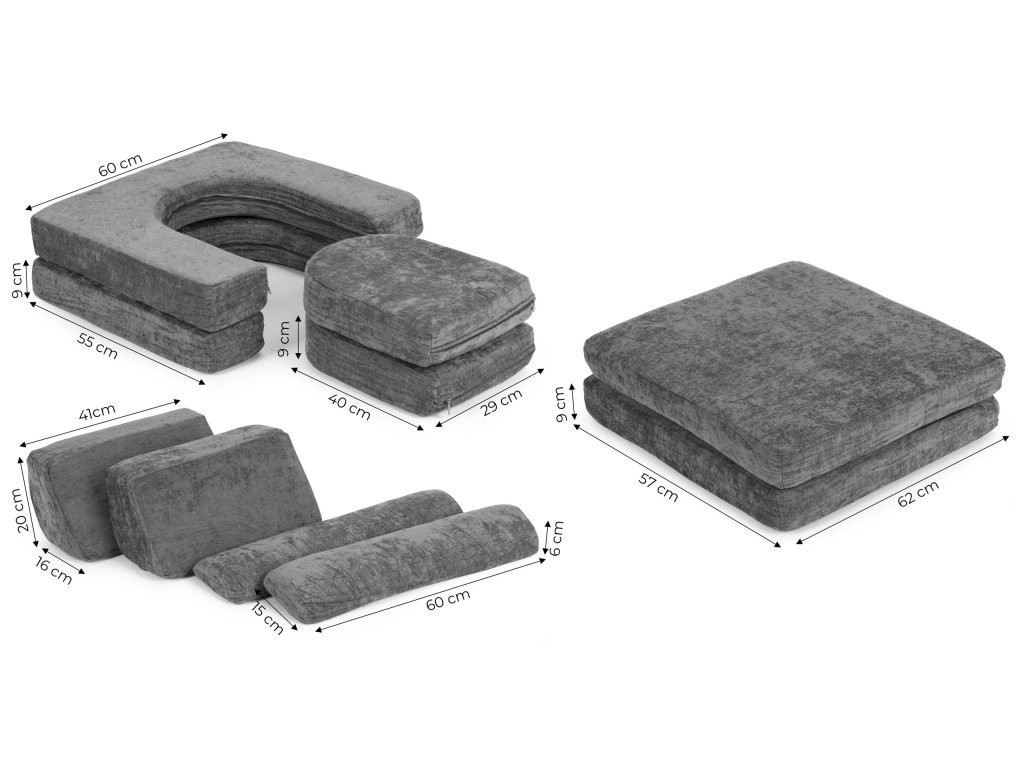 Modulárny dizajn a rôzne tvarované vankúše poskytujú deťom neobmedzené možnosti vytvárania rôznych štruktúr, vaše dieťa si tak môže postaviť dom, hrad alebo vozidlo z pohodlia pohovky. Tento druh hry zaručuje skvelú zábavu pre deti, mimochodom rozvíja ich predstavivosť a manuálne zručnosti.