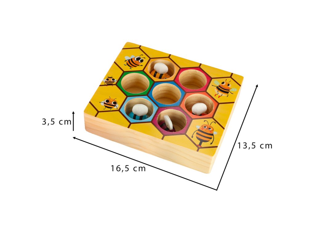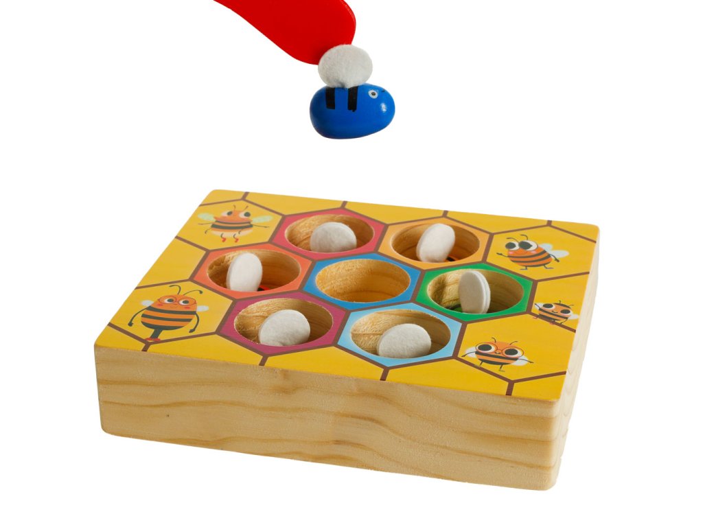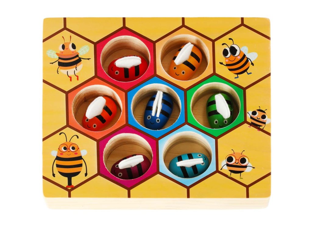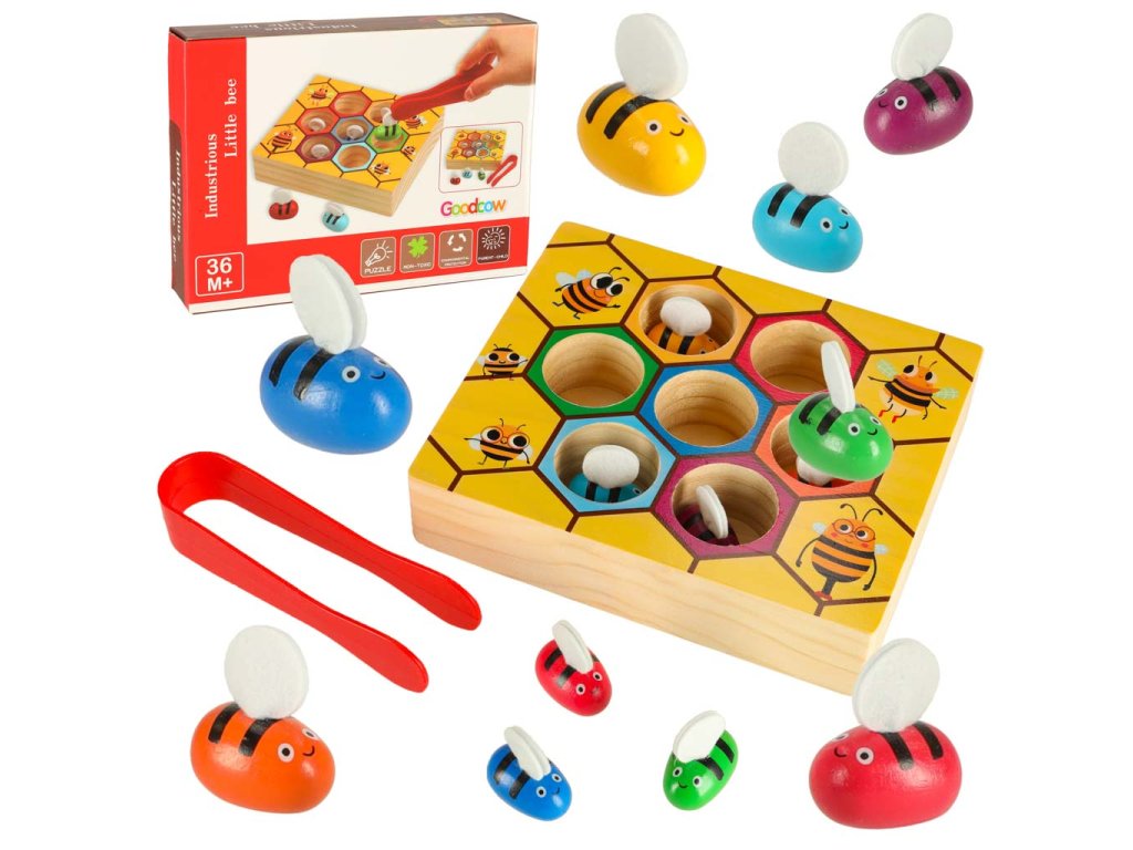 Úkolem dítěte je vybrat barevné včely pomocí přiložené pinzety a poté umístit každou včelu do otvoru odpovídajícího její barvě.