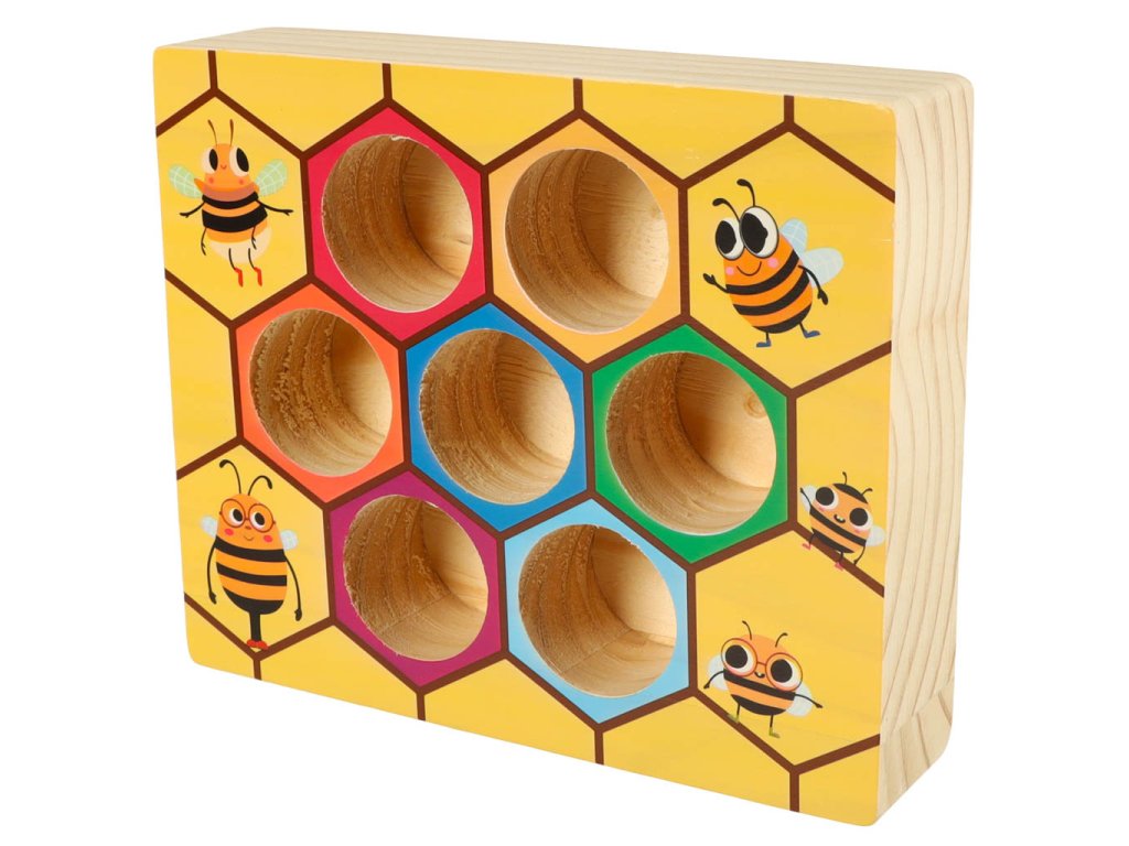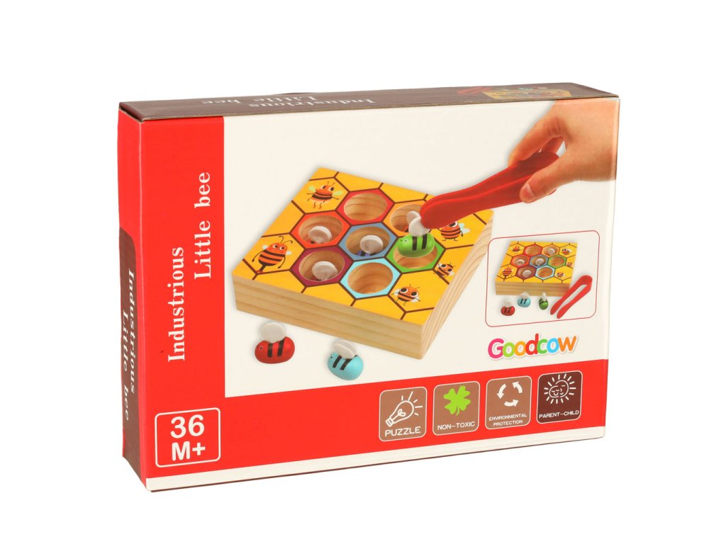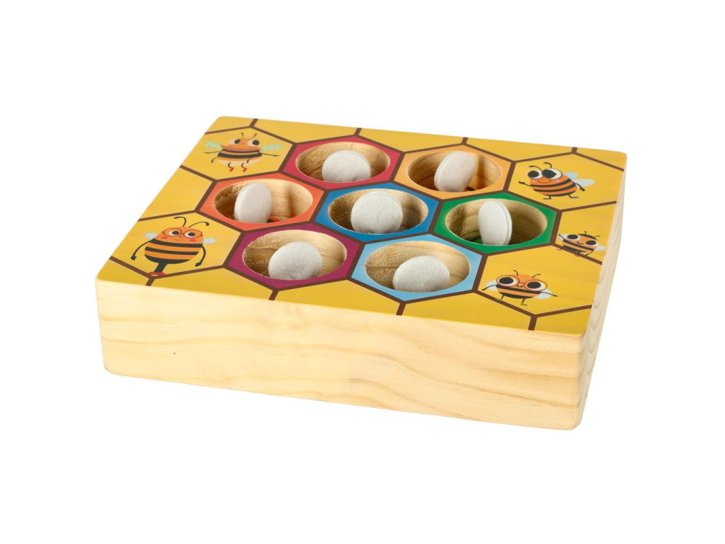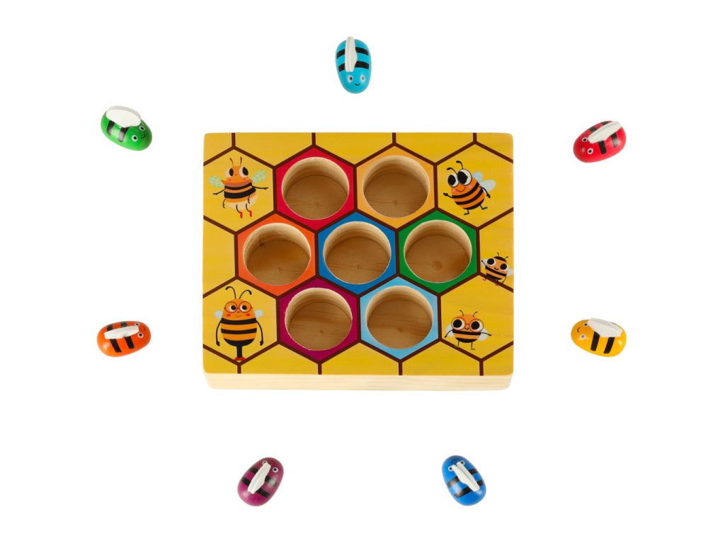 Úkolem dítěte je vybrat barevné včely pomocí přiložené pinzety a poté umístit každou včelu do otvoru odpovídajícího její barvě.