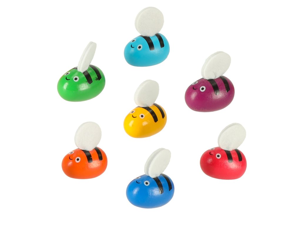 Obsahuje 7 včel - každý v jiné barvě a vrchní deska/podstavec z masivního dřeva . Na podstavci je vtipný obrázek s motivem včelí plástve.
