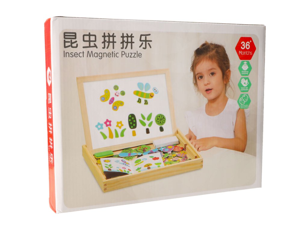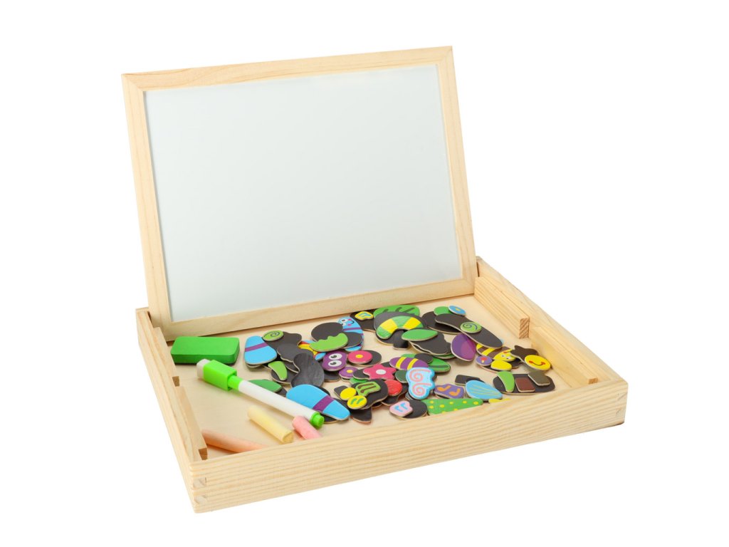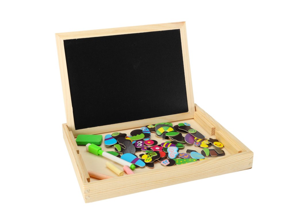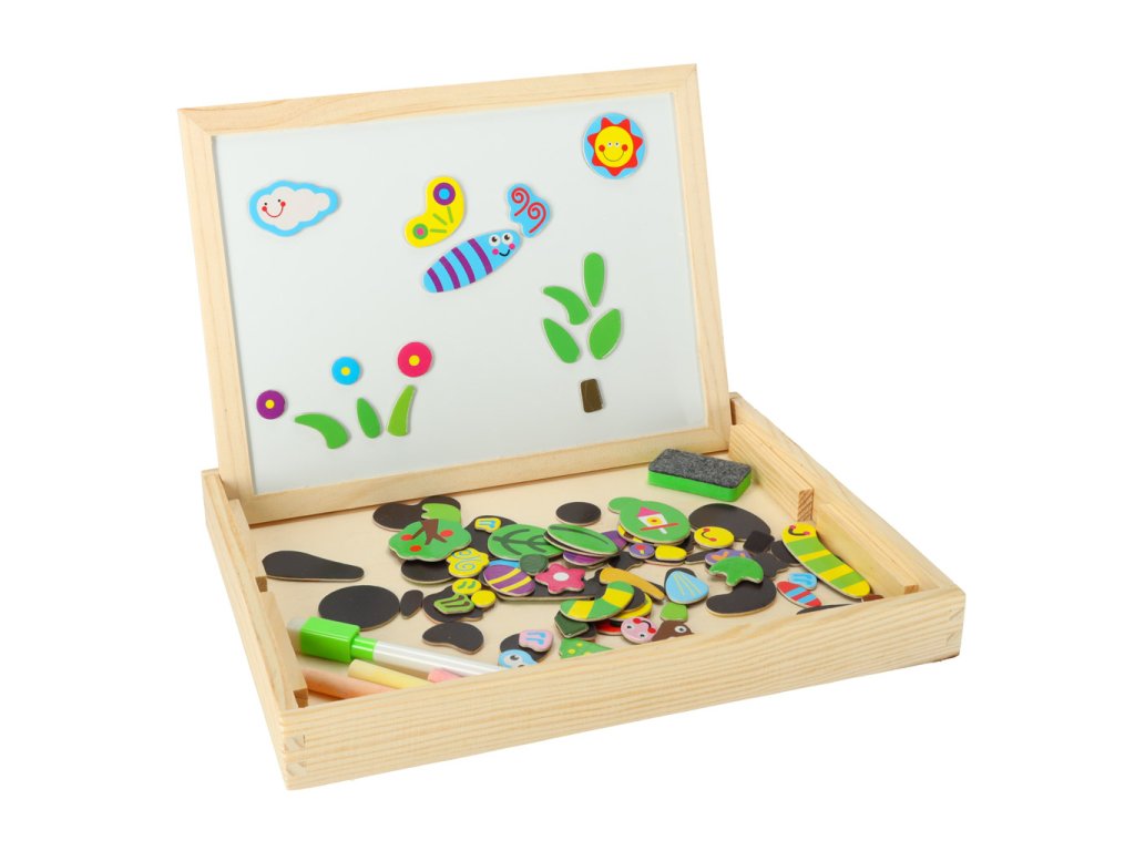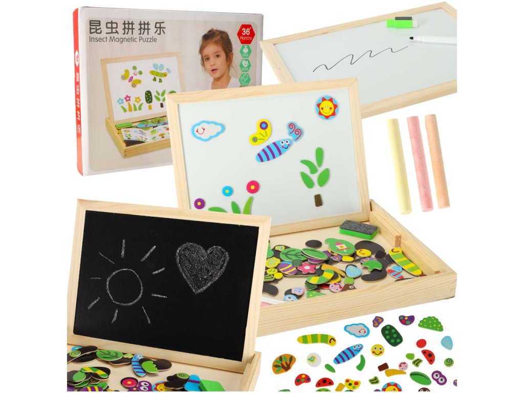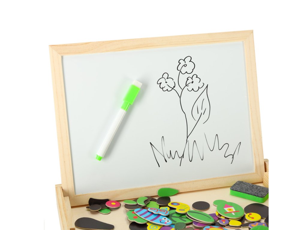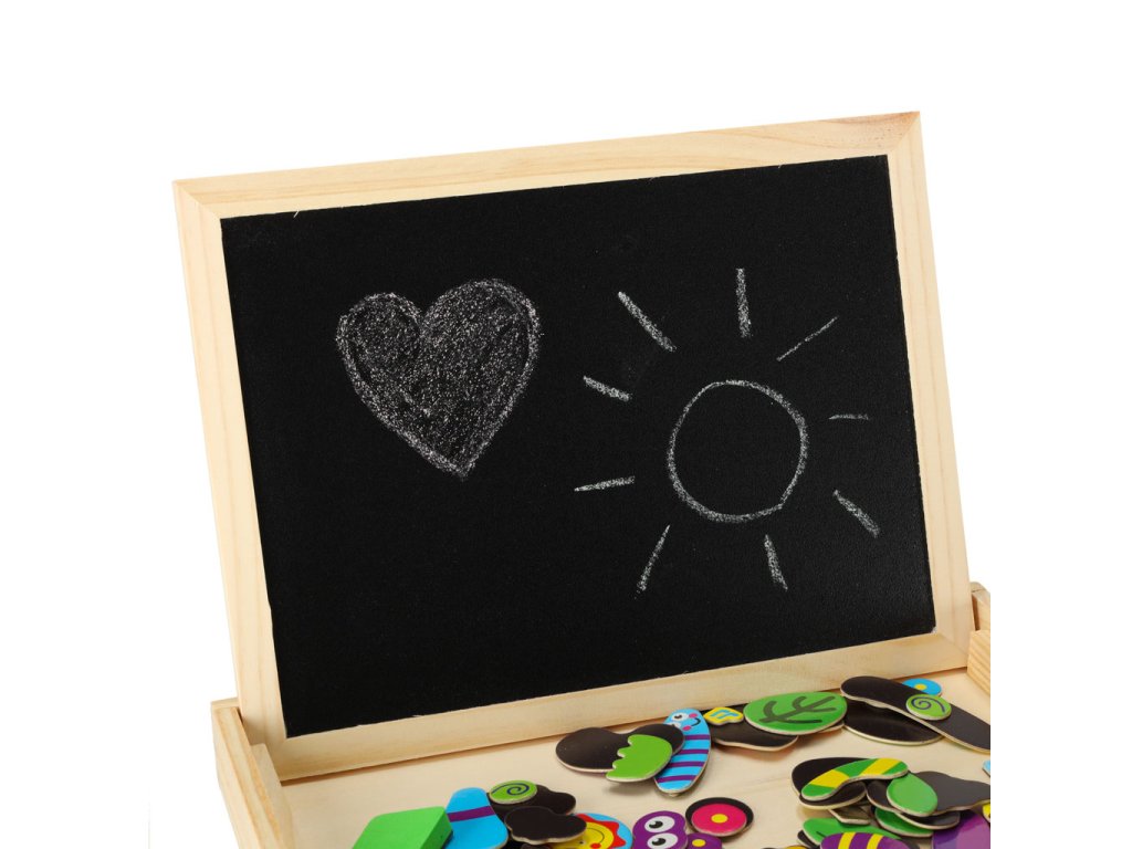 Rozvíjejte kreativitu a logické myšlení svých dětí s touto multifunkční dřevěnou deskou! Oboustranná s magnetickými skládačkami a barevnými fixy. Rozměry. Obsahuje 100 magnetů, křídy a fixy. Ideální hračka pro zabavení a vzdělávání dětí.