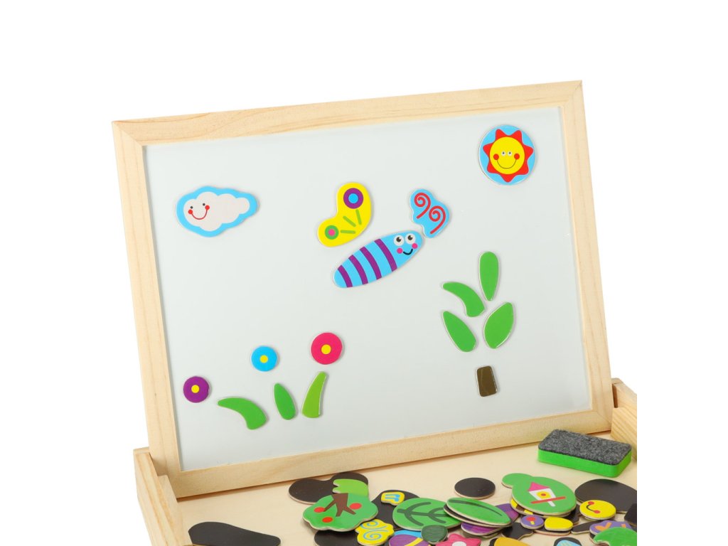 Oboustranná dřevěná deska s magnetickými skládačkami na uspořádání obrázků.