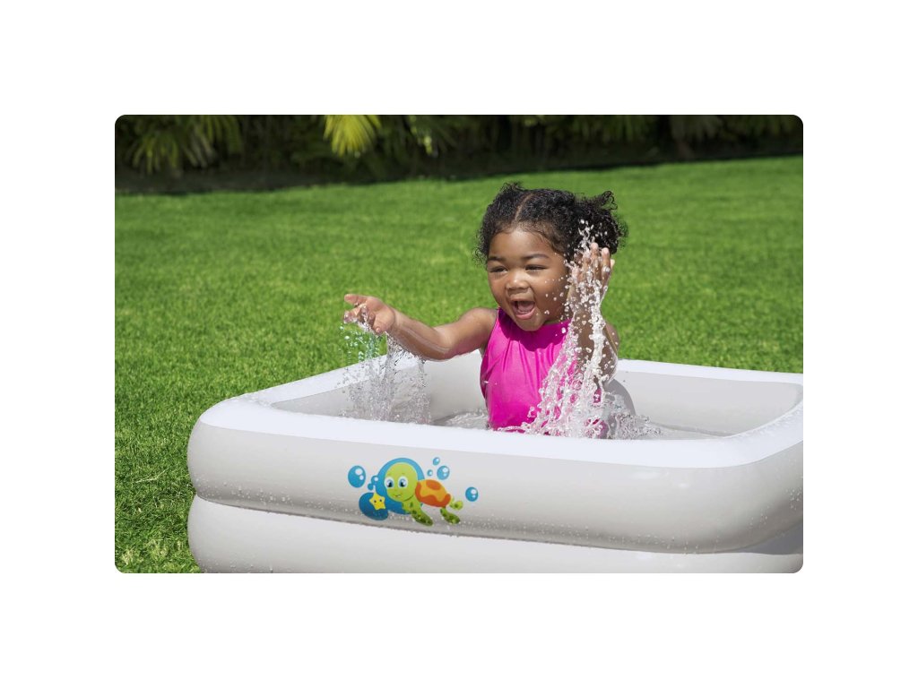 Nafukovacia vaňa s rozmermi 86 x 86 x 25 cm je ideálny na takýto výlet. Je úplne bezpečný pre vaše dieťa, pretože má mäkké, nafukovacie dno.