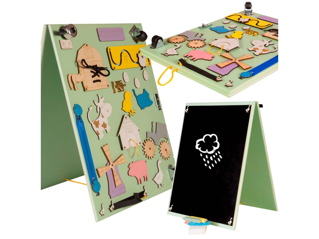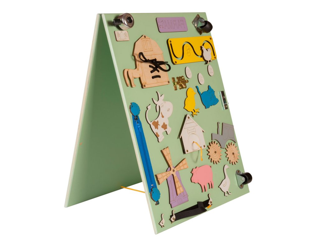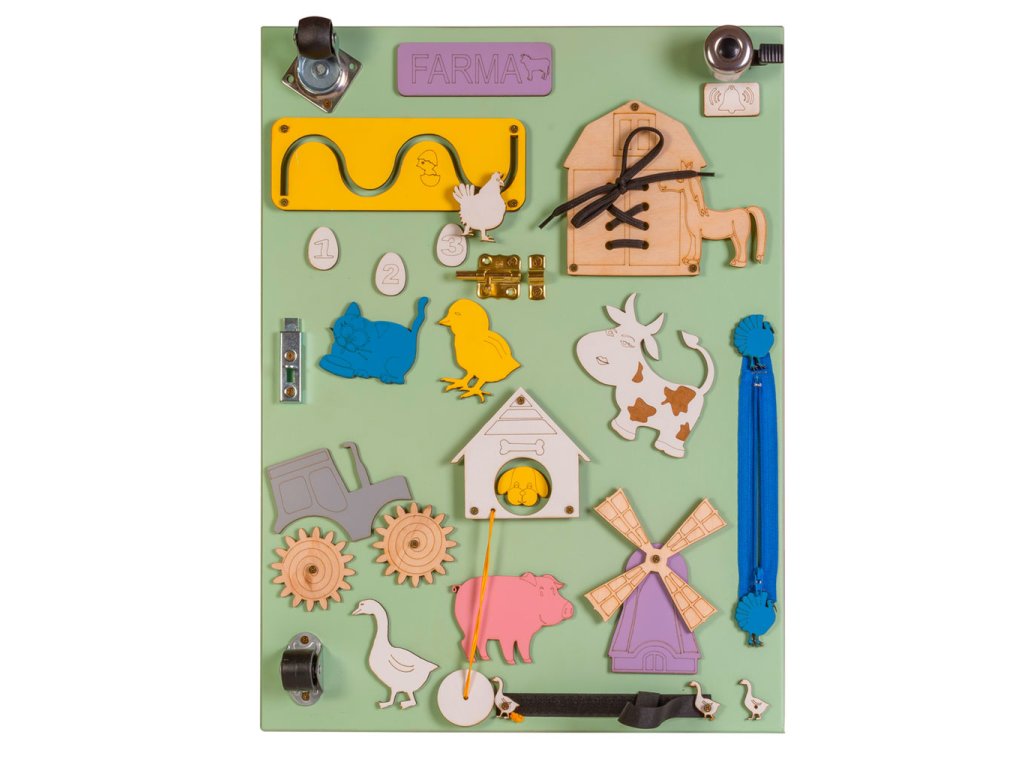Kromě barevných zvířátek na dřevěné desce jsou zde však také řadu pohyblivých prvků, které vám umožní procvičit jemnou motoriku a manuální zručnost - tkaničky, které se můžete naučit zavazovat, zip, zvonek na kolo a mnoho dalšího!