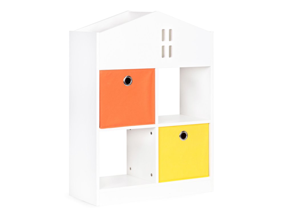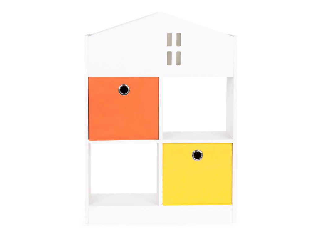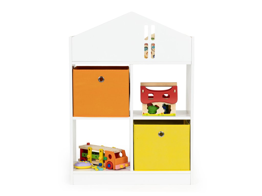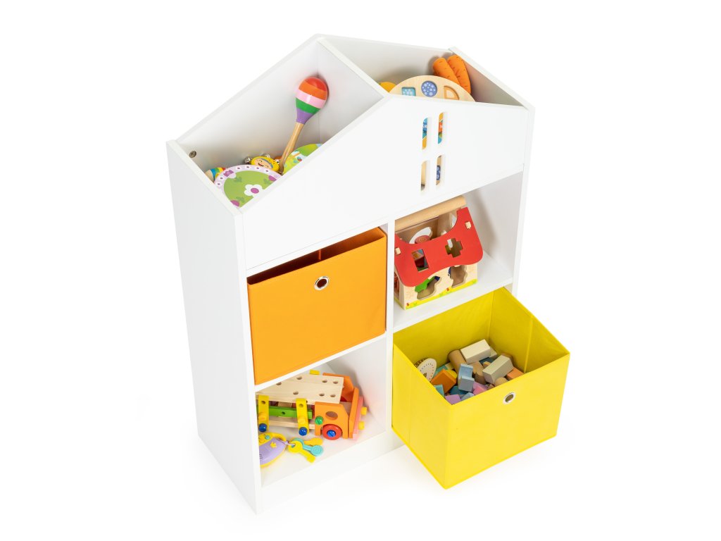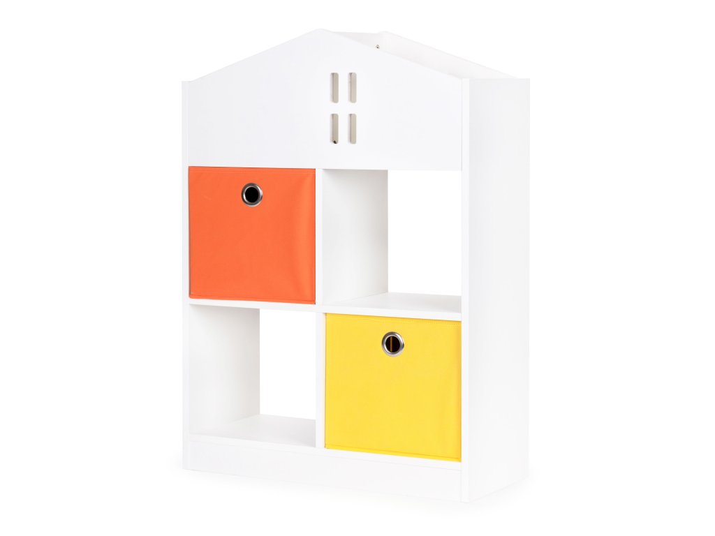 Nábytok bol vyrobený z odolná drevotrieska a dokončil s dyhou odolnou voči poškodeniu. Štyri kňazské polícia a priehradky v hornej časti na hračky, knihy a všetko ostatné, s čím sa vaše dieťatko rado hrá. Okrem toho súprava obsahuje 2 knižné textilné koše, ideálne na kocky alebo menšie hračky.