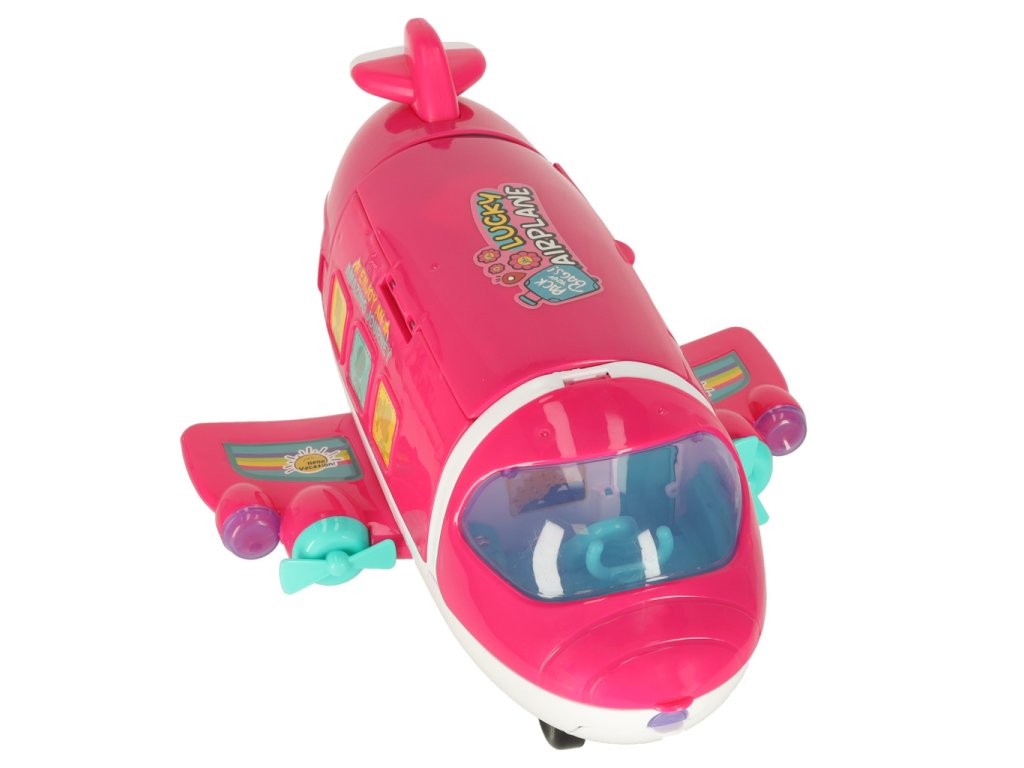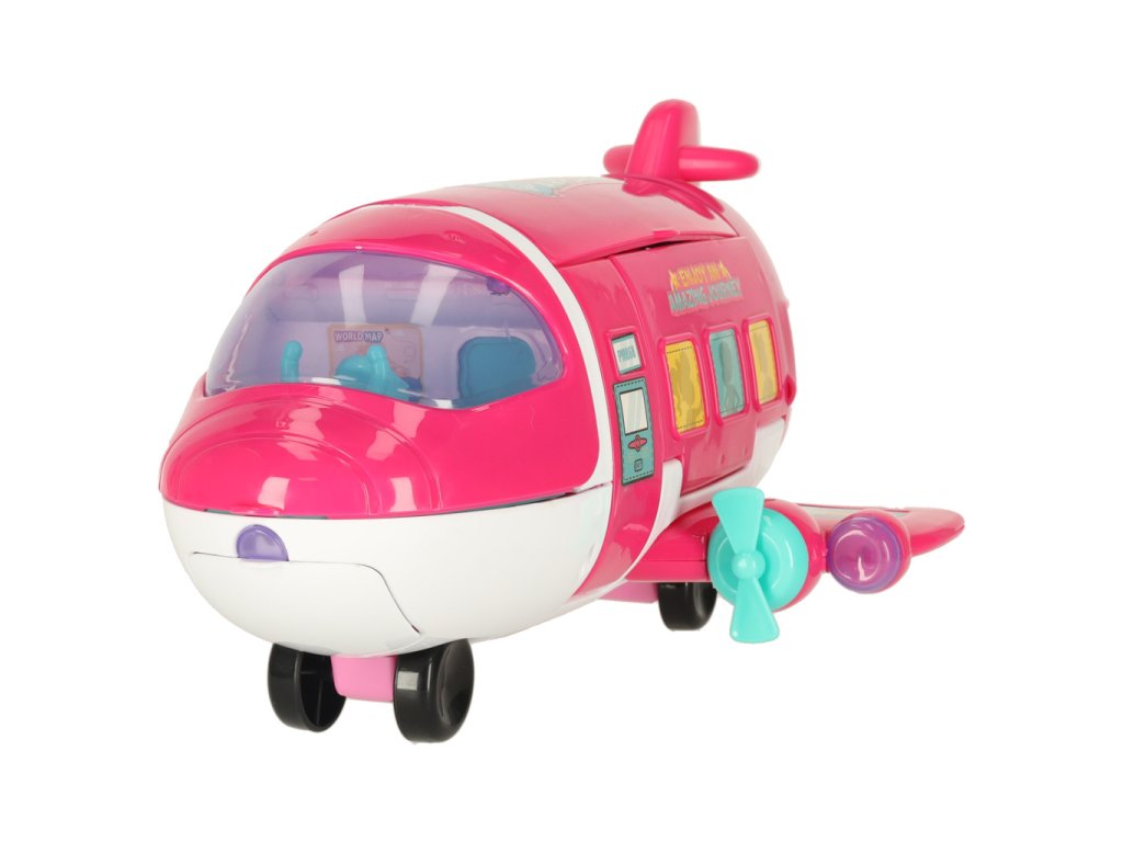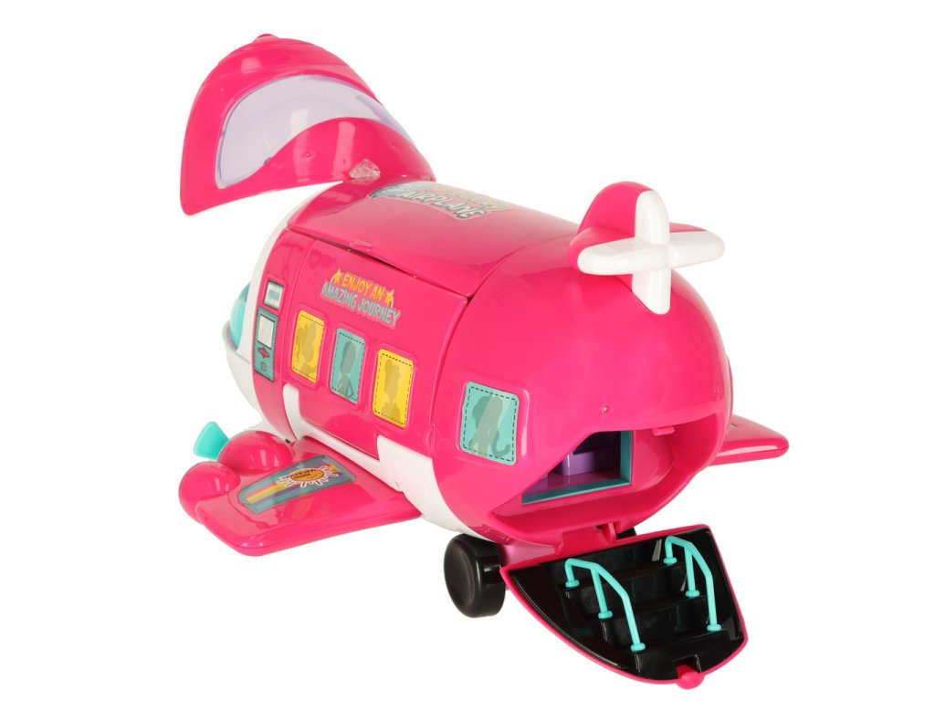 Sada se 14 prvky - skládací letadlo pro děti od 3 let. Růžová s bílými a tyrkysovými prvky. Pohyblivé části, bez napájení. Rozměry: 40x28x22 cm. Balení s okénkem.