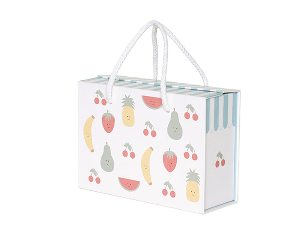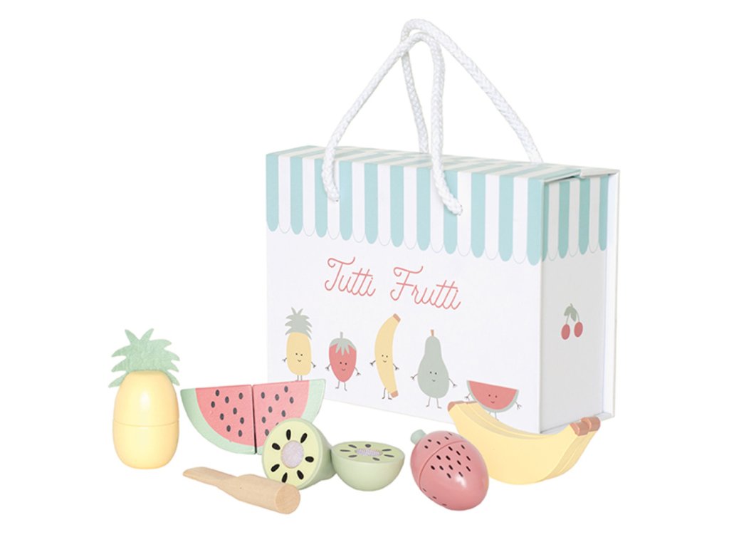Obsahuje: sáček s magnetickým zapínáním, 1 x hruška, 1 x meloun, 1 x jahoda, 1 x ananas, 1 x banán, 1 x nůž