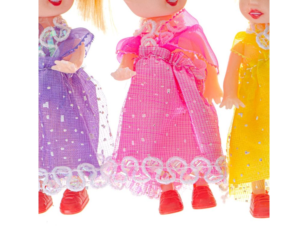 Každá panenka má šaty jiné barvy: růžové, žluté a fialové a červené boty.