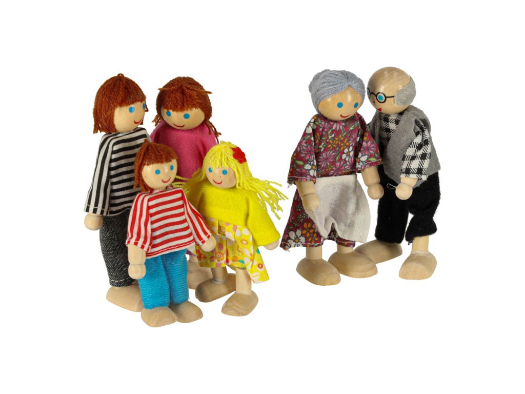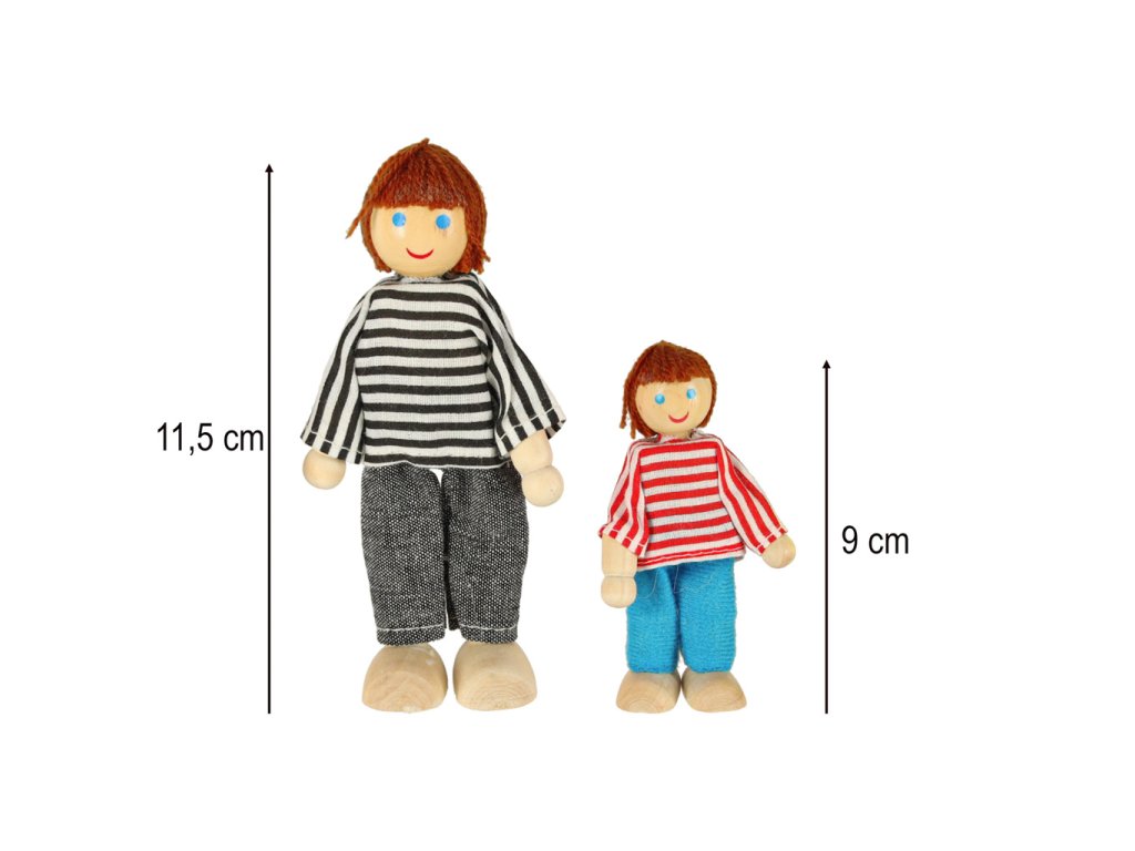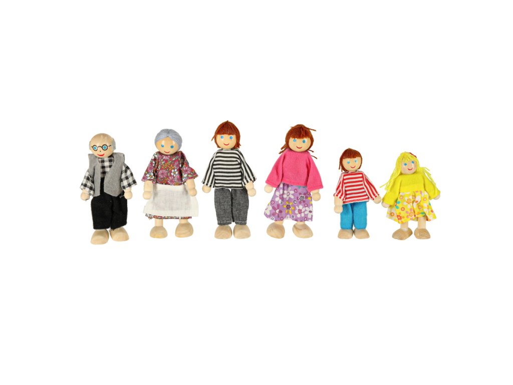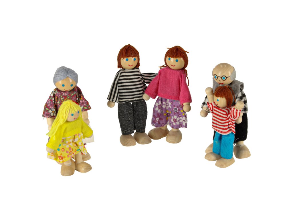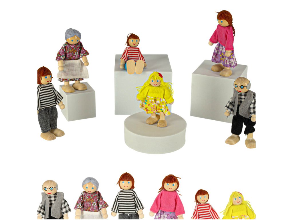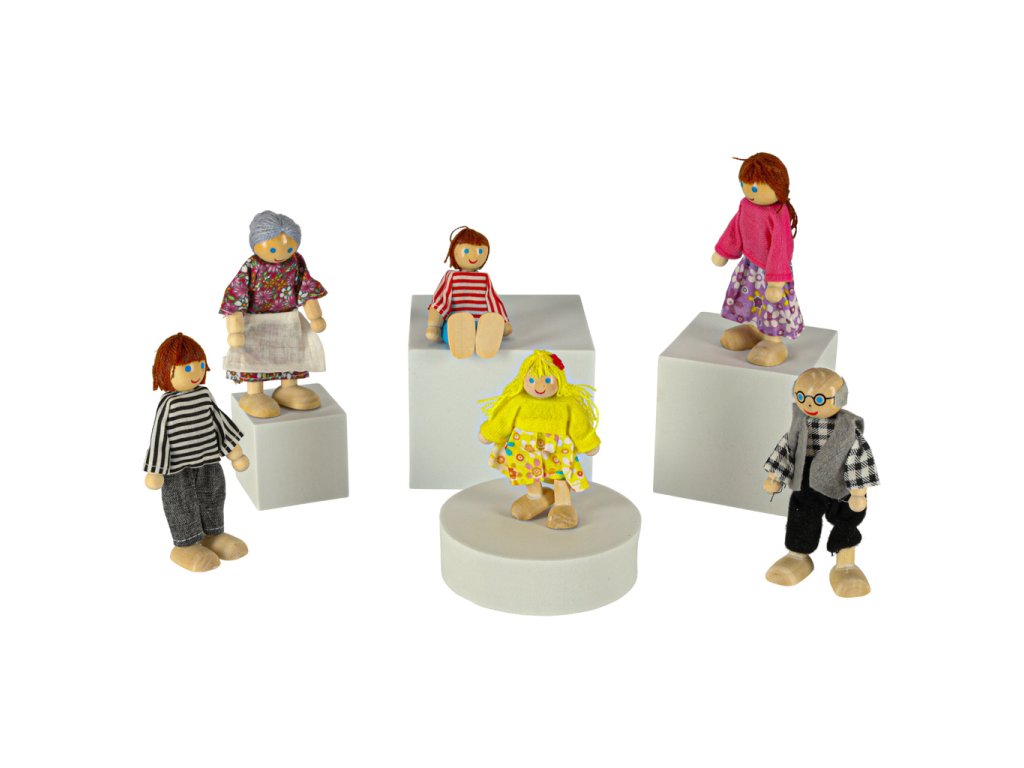 Dřevěné a polyesterové panenky pro děti od 3 let. Součástí je 6 panenek různých velikostí. Větší panenka měří 11,5 cm, menší 9 cm. Rozměry balení: 20 x 12 x 3 cm. Ideálně zabalené ve fólii.