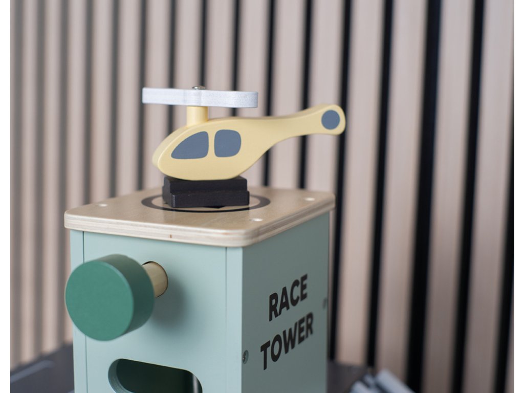 Obsahuje: 1 x garáž s parkovacími místy, vrtulníkem, čerpací stanicí, výtahem s myčkou, 3x autíčka, 1 x vrtulník, 1 x rampa, 1 x soutěžní rampa