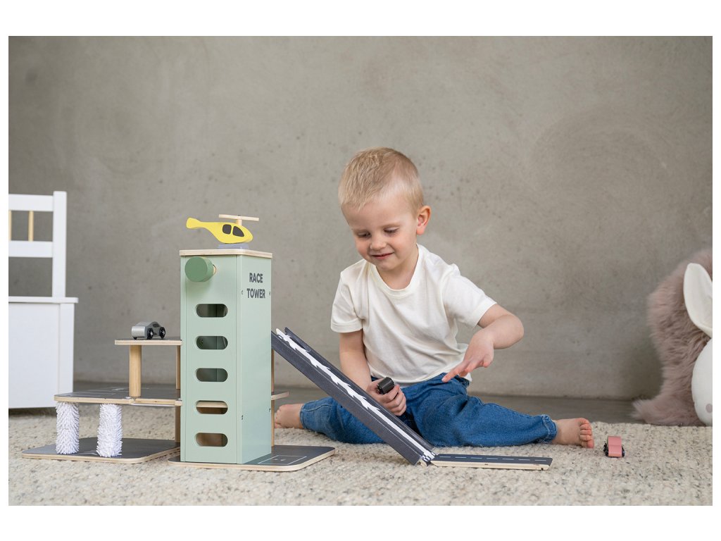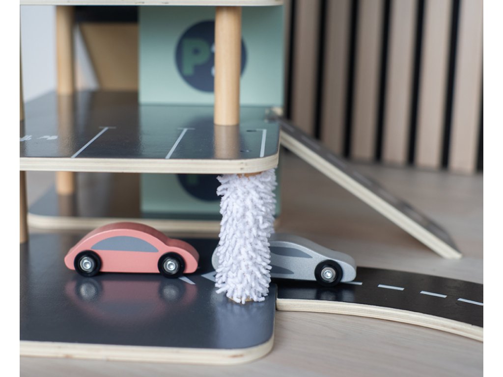 Na plný plyn! Dřevěná garáž Jabadabado nabízí spoustu příležitostí ke hře pro všechny děti, které milují auta. Závody na rampě s kamarády mohou začít, protože jsou zde dvě auta, která mohou jezdit vedle sebe. Kdo vyhraje? Pak pokračujte v jízdě, doplňte palivo nebo nabijte elektromobil a vyjeďte výtahem znovu ven. Pokud se autíčka po cestě ušpiní, rychle se vydejte podél myčky. Pak nastartuj vrtulník, přeleť s ním nad městem a přistaň na heliportu na střeše garáže. Garáž má tři patra, mezi kterými můžeš jezdit s auty. Až bude čas na přestávku, zaparkuj na třech parkovištích. Výtah se ovládá malým volantem, což znamená, že auta lze snadno přepravovat do různých pater. S touto kreativní a zábavnou garáží se děti zabaví na celé hodiny. Garáž je kompatibilní se všemi hračkami Jabadabado, které obsahují kolejnice. Podporuje kreativní hru a zaručeně se stane perfektním dárkem k narozeninám.