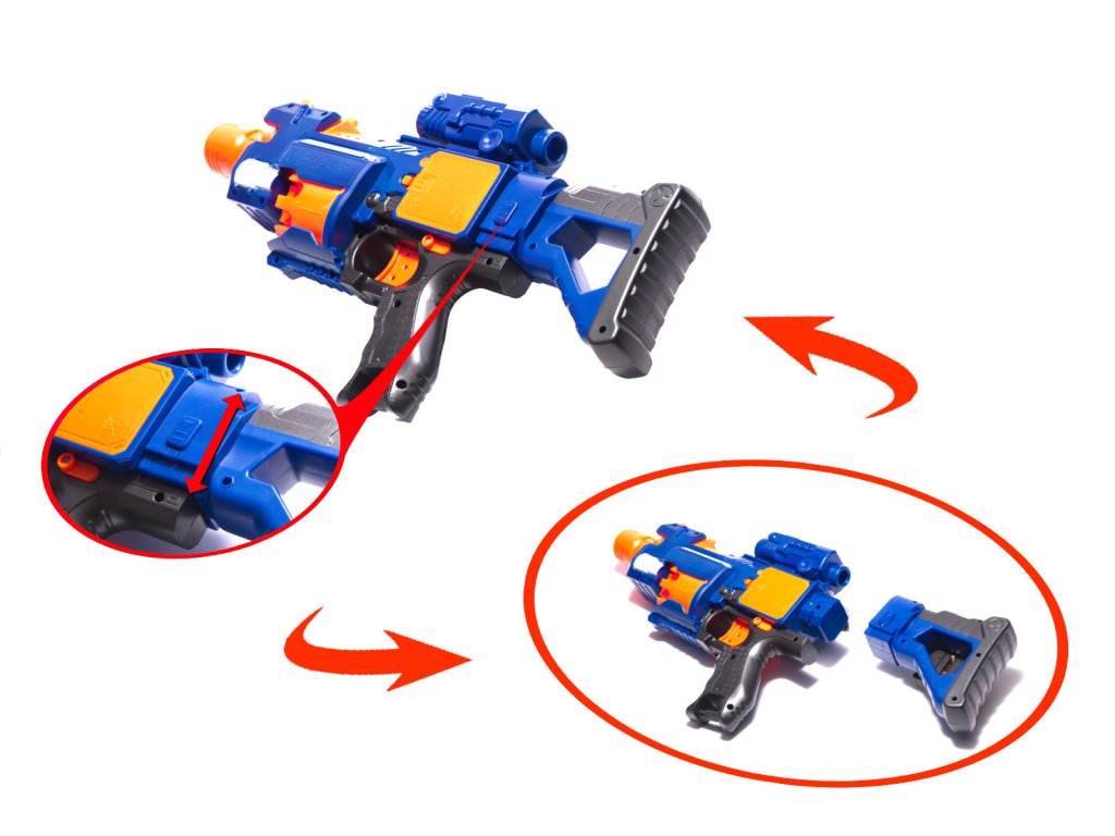 Puška je vybavena hlavní podobnou těm, které se používají u revolverů. Do hlavně se vejde 10 pěnových šípů najednou.