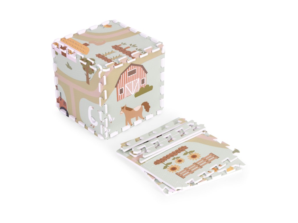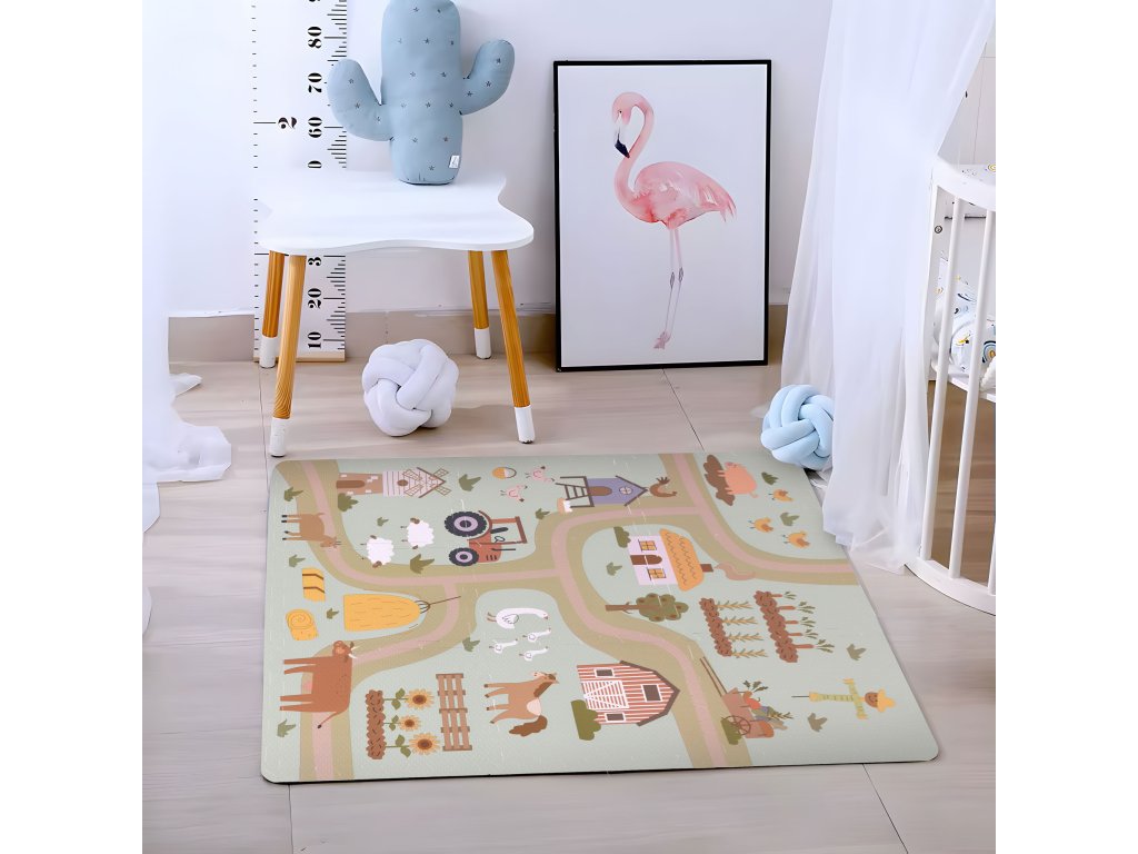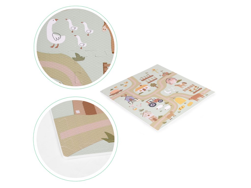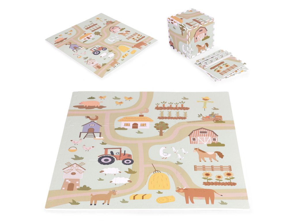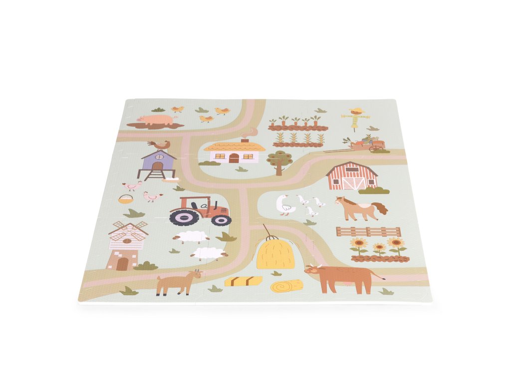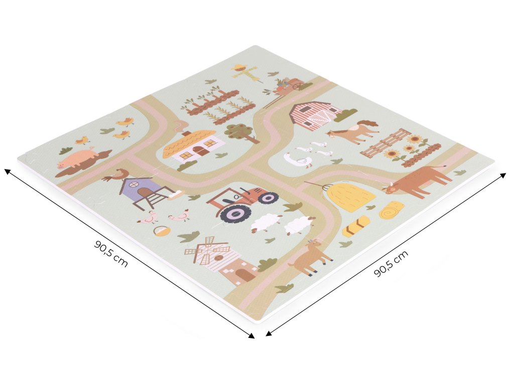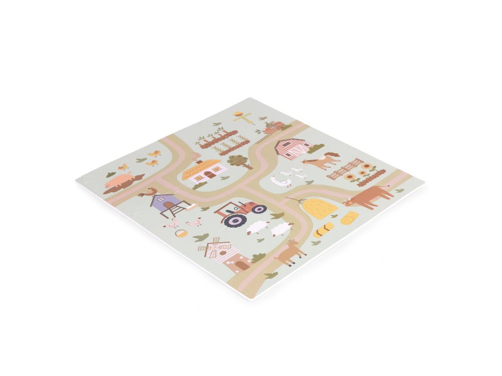 Podložka představuje barevný design farmy plný vozidel, hospodářských zvířat a venkovské krajiny. Poskytuje tak dětem kreativní a vzrušující formu hry, ideální pro malé milovníky přírody. Každý detail na podložce byl pečlivě navržen s důrazem na detail, aby děti povzbudil k prozkoumávání a interakci s okolím . Jasné barvy a realistické ilustrace podněcují zájem a rozvíjejí představivost a vybízejí k vytváření vlastních dobrodružství na farmě.