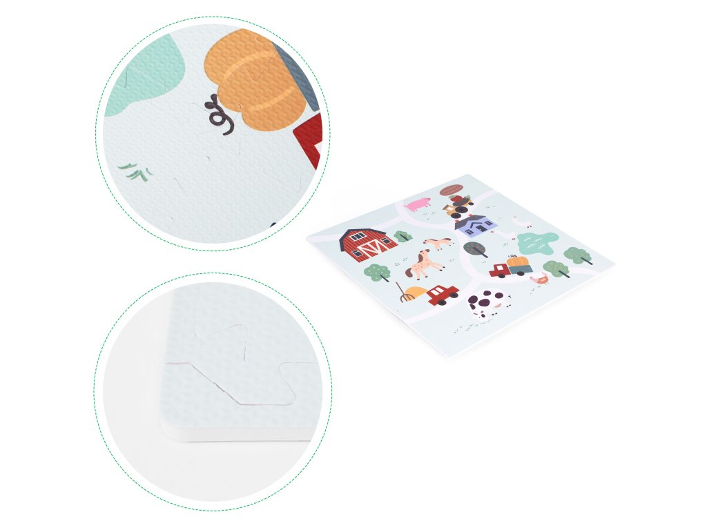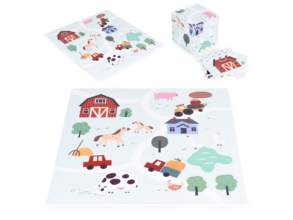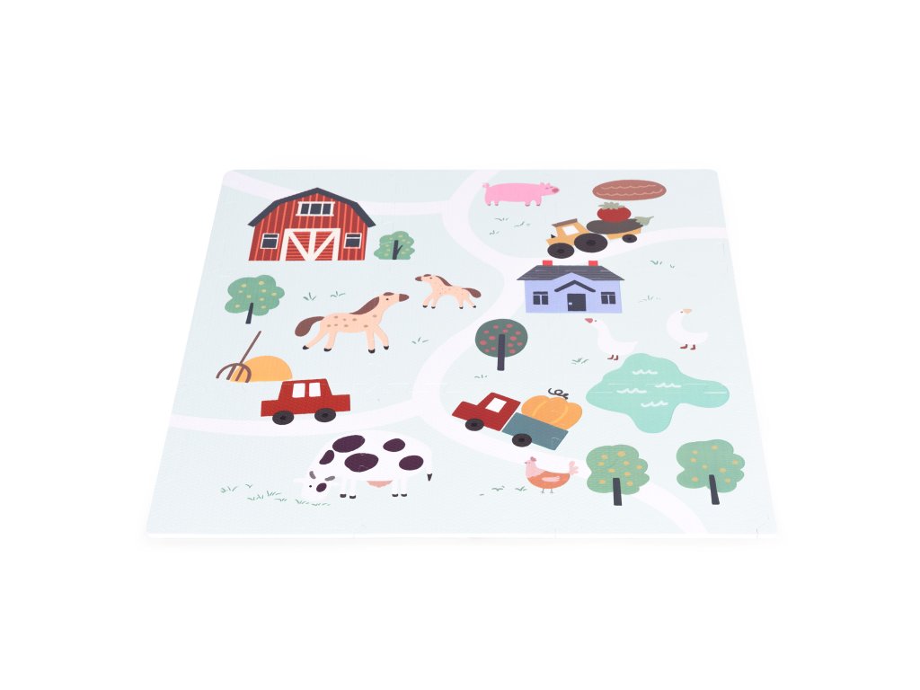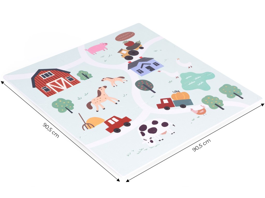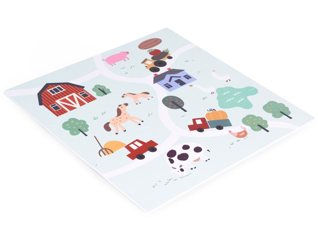 Podložka představuje barevný design farmy plný vozidel, hospodářských zvířat a venkovské krajiny. Poskytuje tak dětem kreativní a vzrušující formu hry, ideální pro malé milovníky přírody. Každý detail na podložce byl pečlivě navržen s důrazem na detail, aby děti povzbudil k prozkoumávání a interakci s okolím . Jasné barvy a realistické ilustrace podněcují zájem a rozvíjejí představivost a vybízejí k vytváření vlastních dobrodružství na farmě.