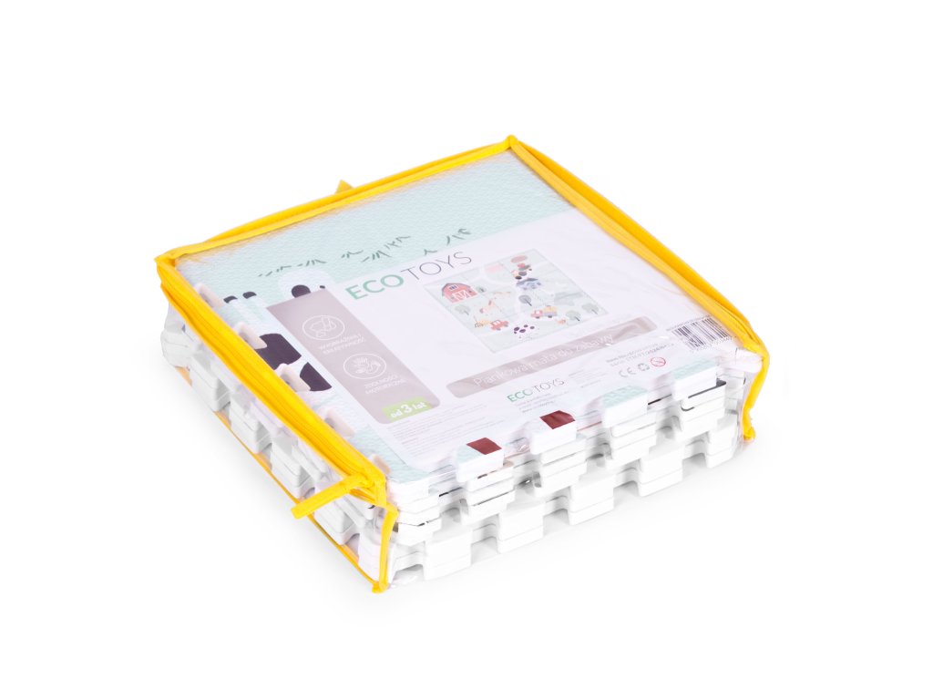 - Podložka se skládá z 9 barevných čtverců a 12 dalších prvků které mají na okrajích speciální "zoubky", takže je lze volně kombinovat. Tloušťka podložky ( 1 cm ) poskytuje dostatečnou ochranu proti pádu a je příjemně měkká.