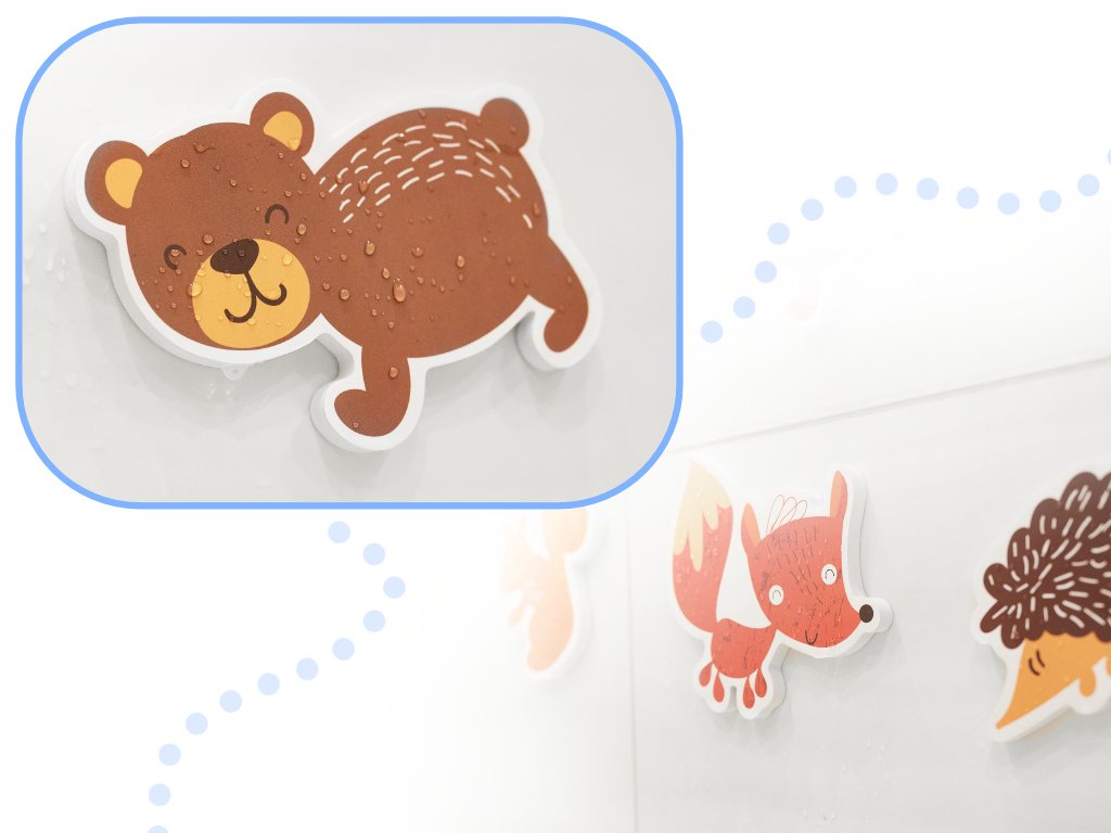 Všechny části jsou vyrobeny z měkké a odolné pěny. K přilepení puzzle na vanu nebo dlaždice nepotřebujete lepidlo. Stačí je namočit do vody.