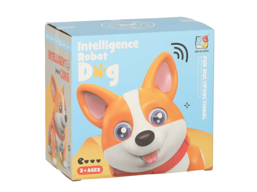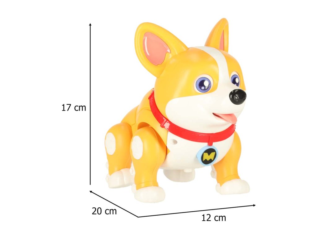 Interaktivní pes Corgi s pohyblivýma očima, jazykem a tlapkami. Chodí, svítí a hraje hudbu. Ideální pro děti od 3 let. Baterie nejsou součástí balení. Rozměry: 20 x 12 x 17 cm.