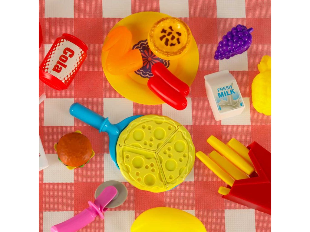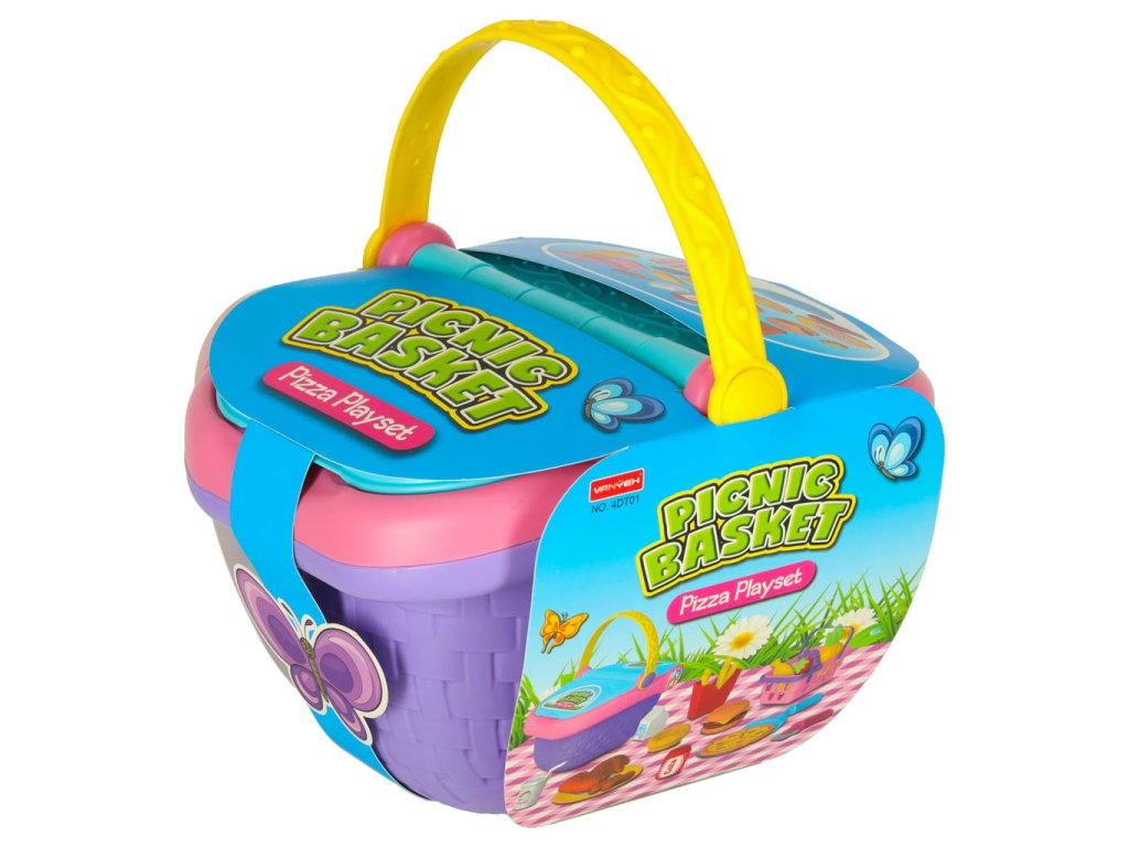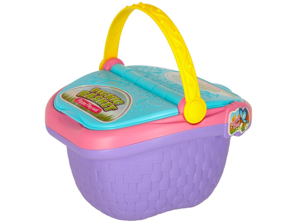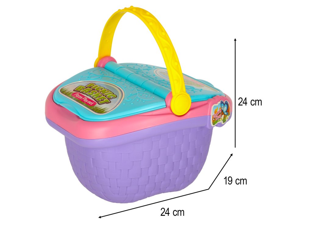 Piknikový koš s pizzou pro děti od 3 let. S dvojitými chlopněmi a barevnými variantami. Obsahuje samolepky, olejničku a hrací prvky. Ideální pro zábavné pikniky. Rozměry: 39,5 x 60 cm.