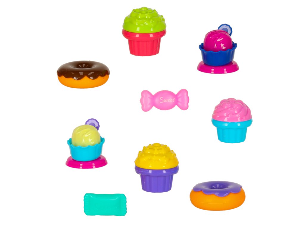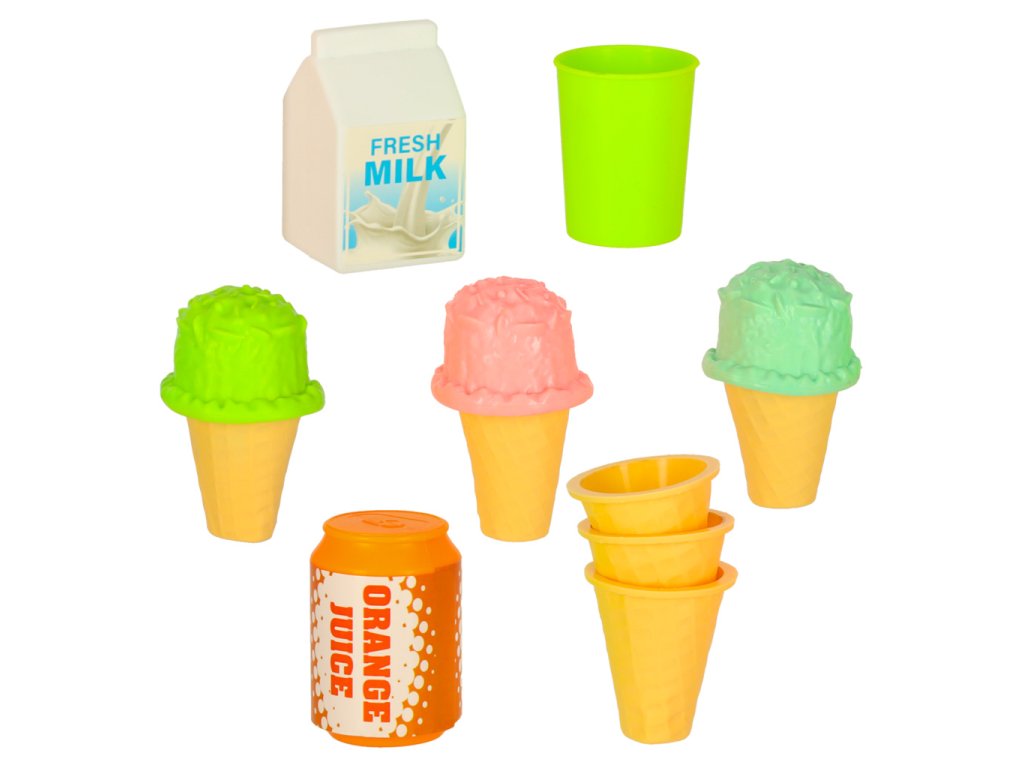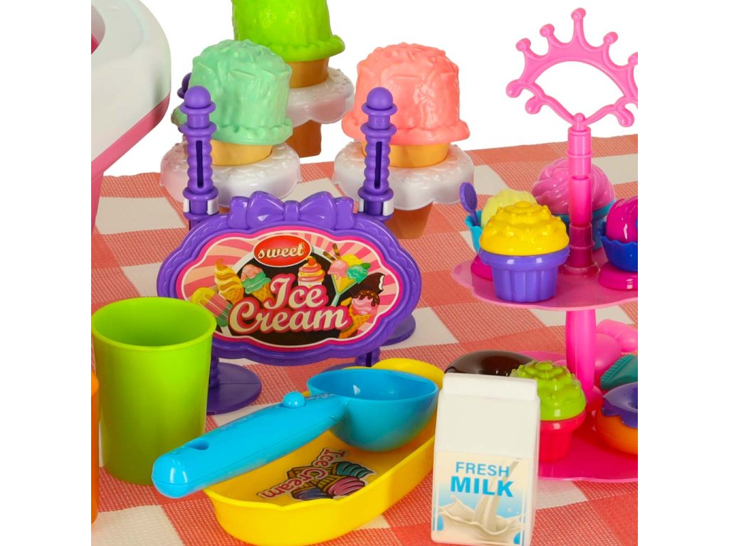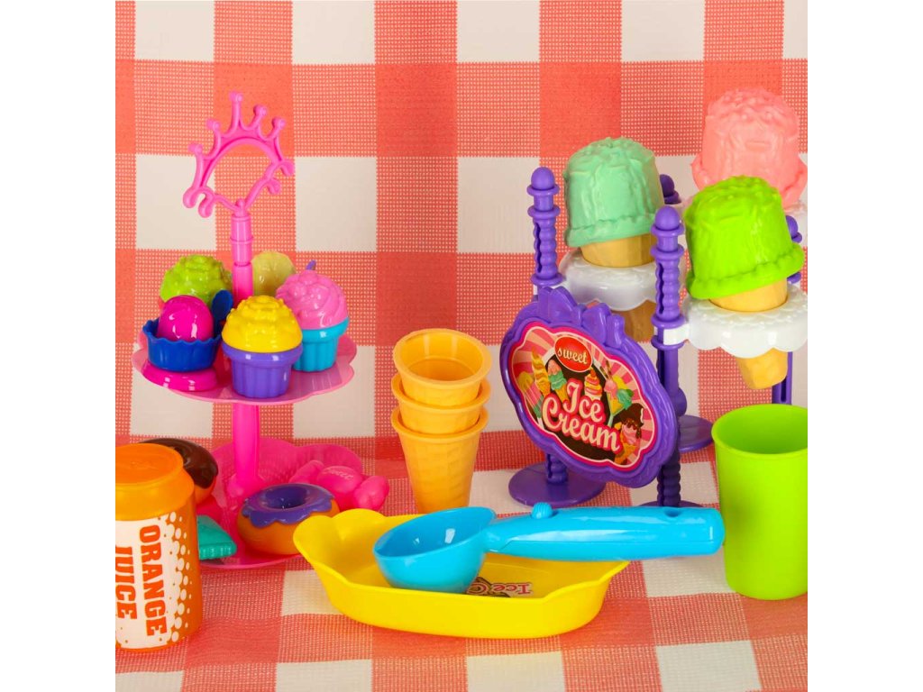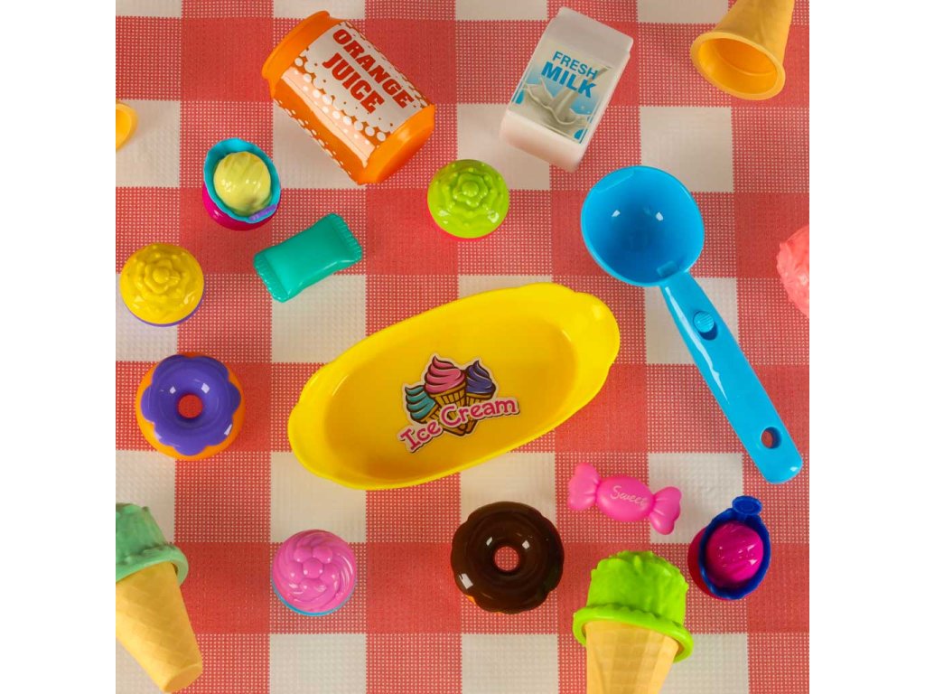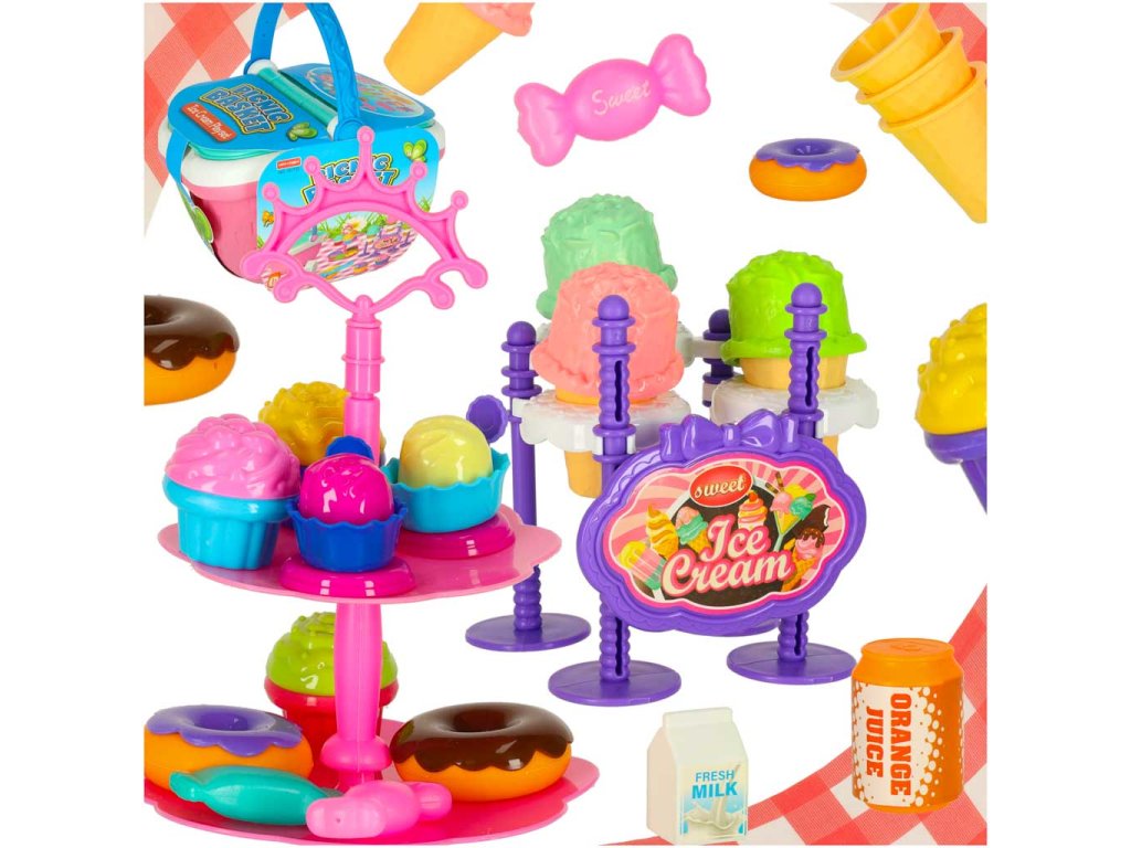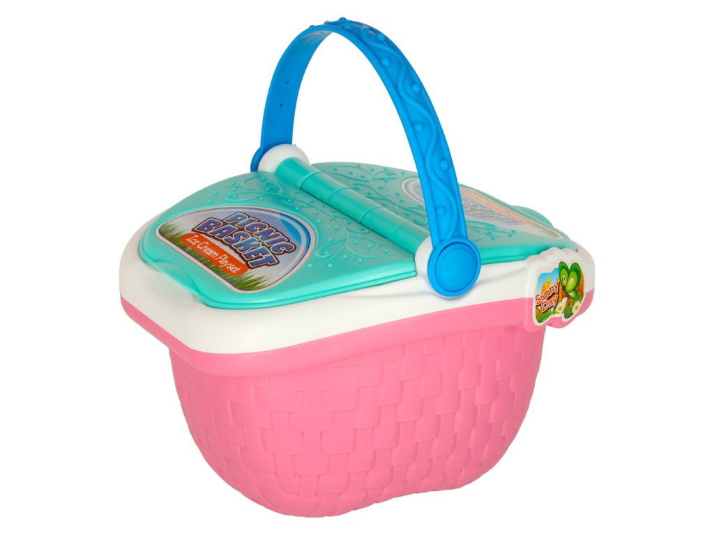 Dvě otevírací klapkyVrchní část koše není odnímatelná Barva: růžová, bílá, celadon, modrá Materiál : plast, papír Materiál tkaniny: plastové, mírně pogumované Prvky: zmrzlina, koblihy, zákusky, mléko, džus, pohár, cukrovinky, lžíce na zmrzlinu, tác, talíř, stojan na zmrzlinu, obal na zmrzlinu