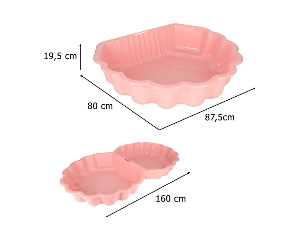 - Typ výrobku: dětská hračka: Dvoudílné pískoviště / pískoviště + bazén- Použití: Hrát si s pískem a vodou Věk dítěte: Věk dítěte: 18 měsíců +- Barva: Odstíny růžové- Materiál: Vysoce kvalitní plast odolný proti UV záření a vodě.- Tvar: .- Odolnost vůči povětrnostním vlivům: Ano - Protiskluzová úprava: Ano, dno s protiskluzovým reliéfem.- Uzamykatelné: Ano - jeden díl lze použít jako víko Snadné skladování: Ano - jeden plášť lze složit do druhého - Použití: Za teplého počasí ji lze použít jako bazén Typ hry: Pískoviště, bazén, smyslové hřiště - Montáž: Montáž: výrobek je připraven k použití - není nutná žádná montáž Skladování: Vkládání jednoho pláště do druhého; snadné čištění Rozměry jednoho pláště: - Šířka: 87,5 cm- Délka: 87 cm: 80 cm.- Výška: 19,5 cm Rozměry rozloženého pískoviště (dvě schránky): - Šířka: 87,5 cm- Délka: 160 cm.- Výška: 19,5 cm- Pískoviště je zabaleno v kartonové krabici s rozměry: 89 x 81 x 21 cm
