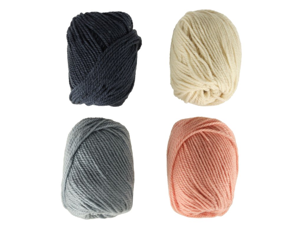 Sada obsahuje čtyři příze v klasických barvách : krémová, šedá, tmavě modrá a oranžová. Tyto barvy se navzájem dokonale doplňují a dávají vám možnost vytvořit kontrastní nebo kontrastní barvy harmonické projekty DIY.