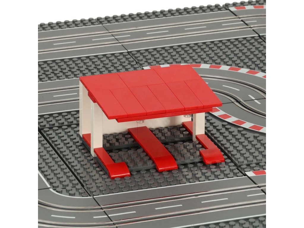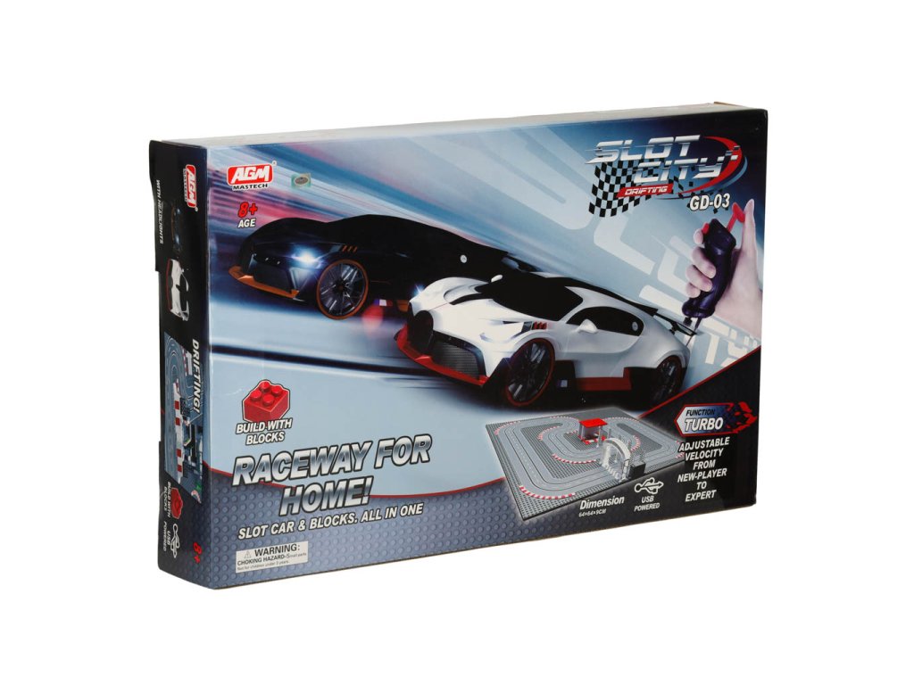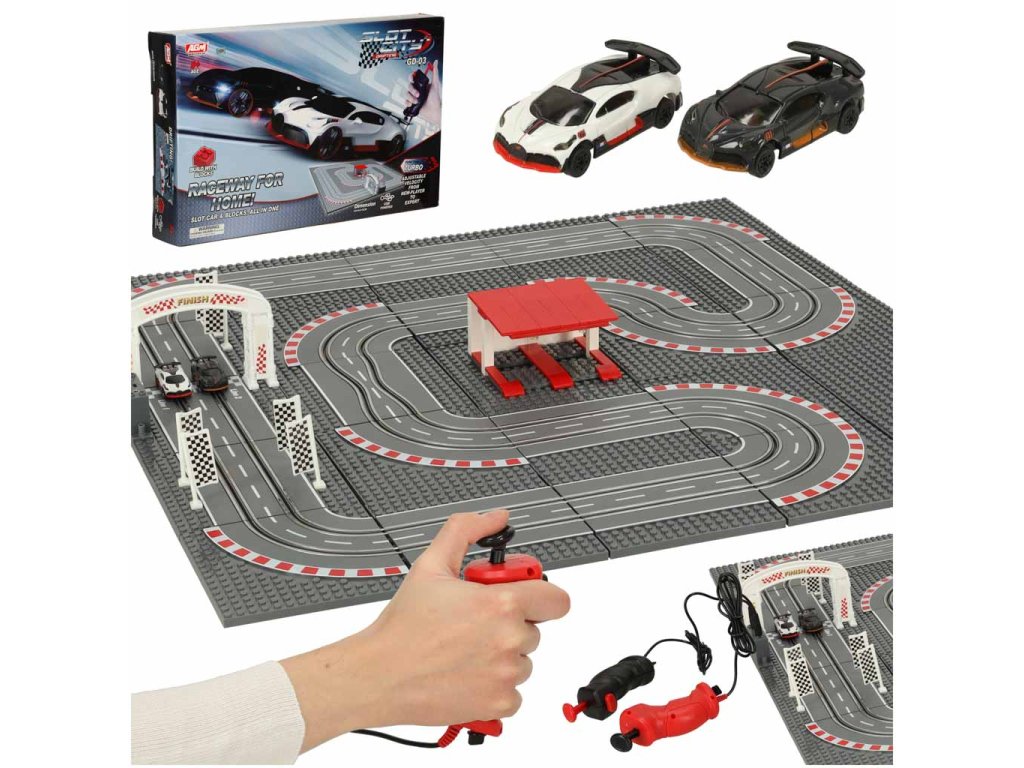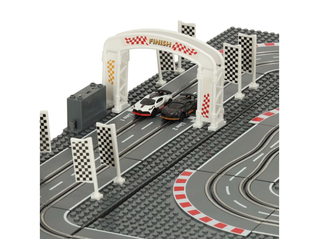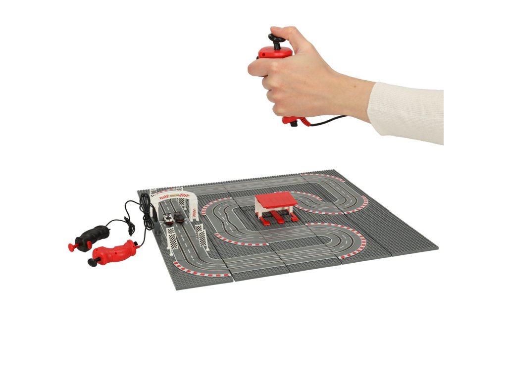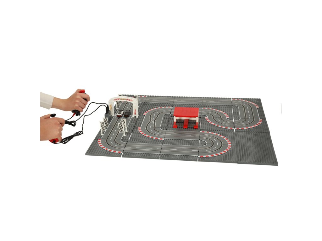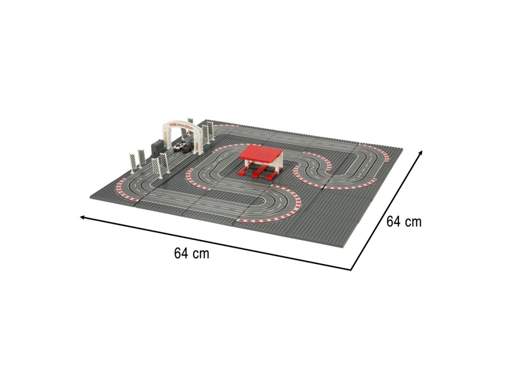 Stavebnice pro děti od 8 let s autíčky a řidiči. Obsahuje 25 kostek dráhy, 24 kostek garáže, příslušenství, autíčka, řidiče, napájecí kabel, látku a samolepky. Rozměry: 64x64 cm.