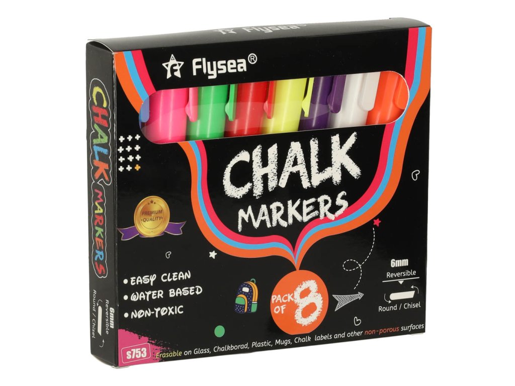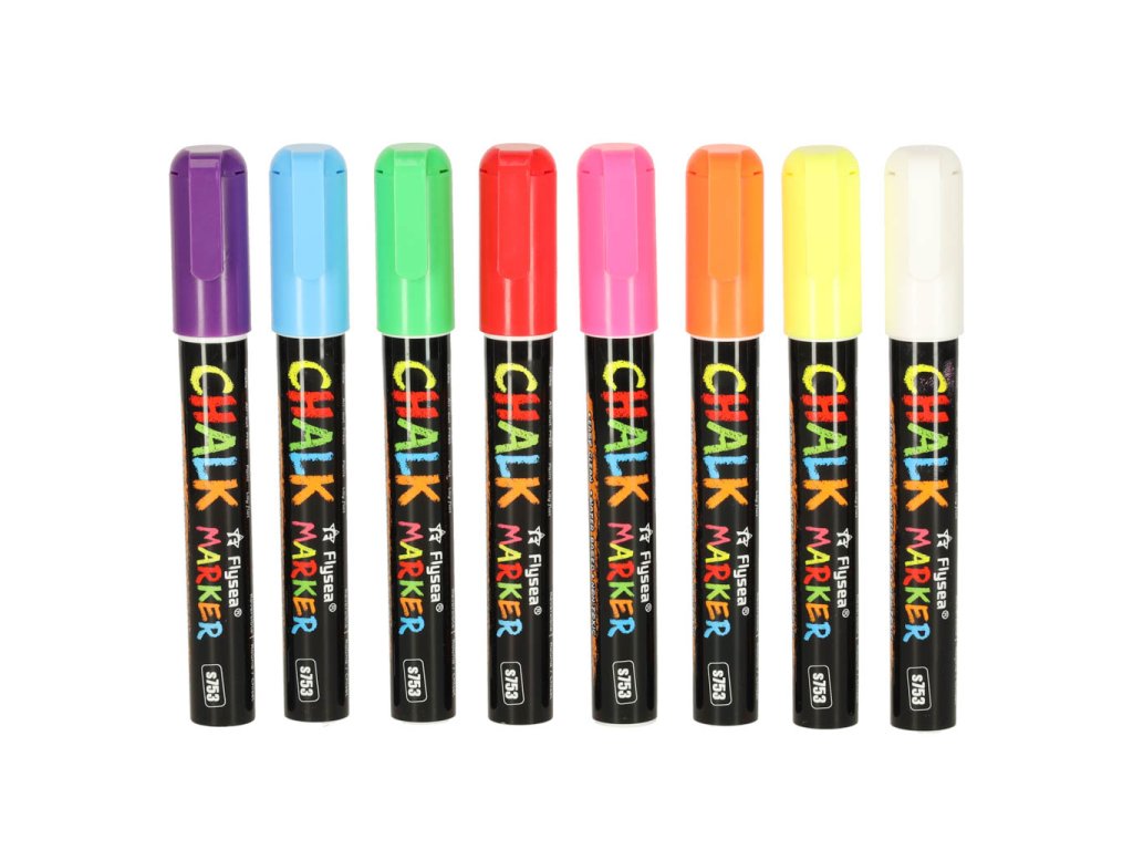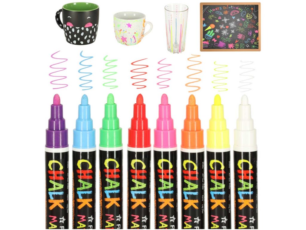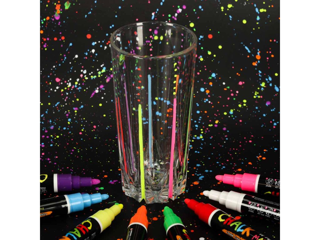 Tato sada 8 křídových fixů je ideální volbou pro vytváření kreseb, nápisů a dekorací na různých hladkých površích - tabulích, skle, zrcadlech, sklenicích nebo plastových předmětech. Ideální pro pro domácí i profesionální použití, například v kavárnách, restauracích nebo školách.