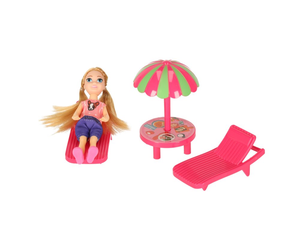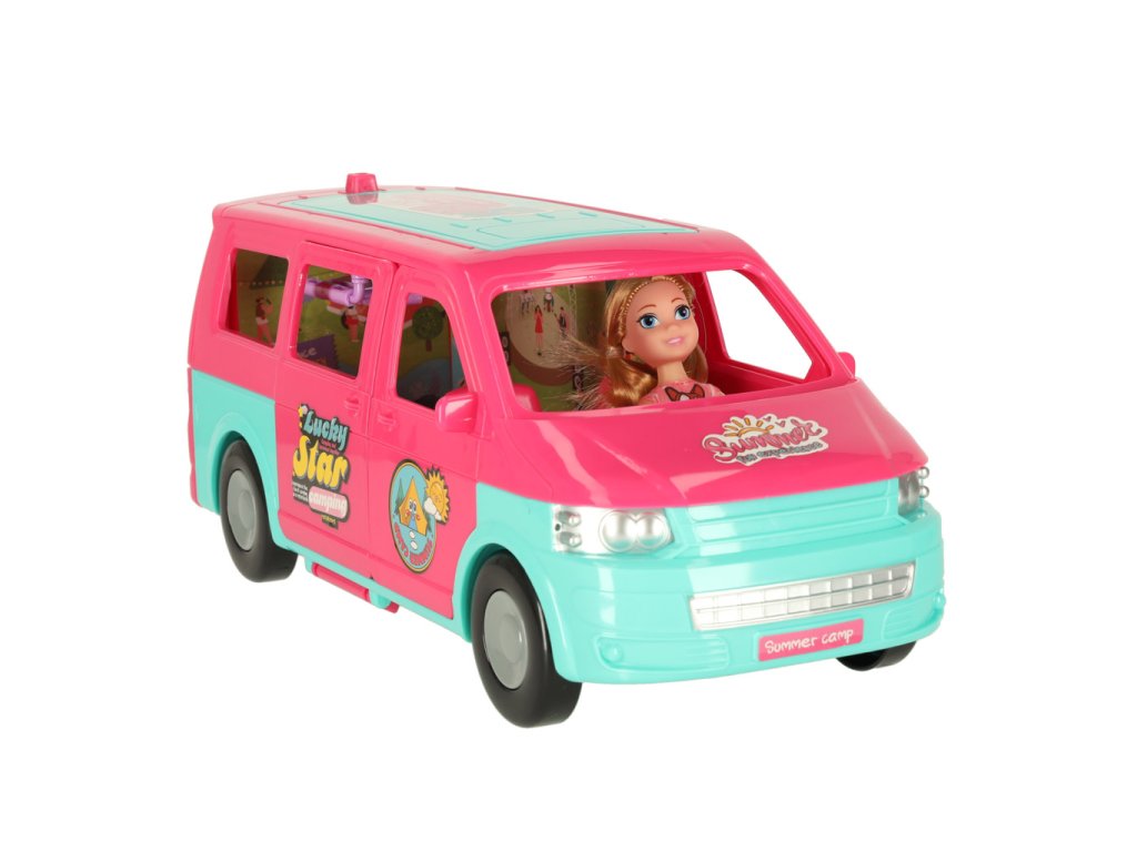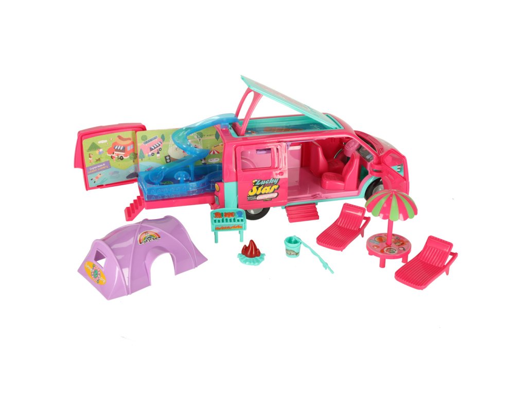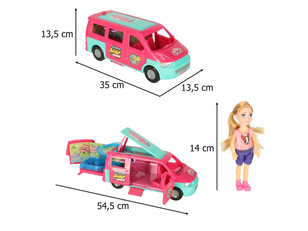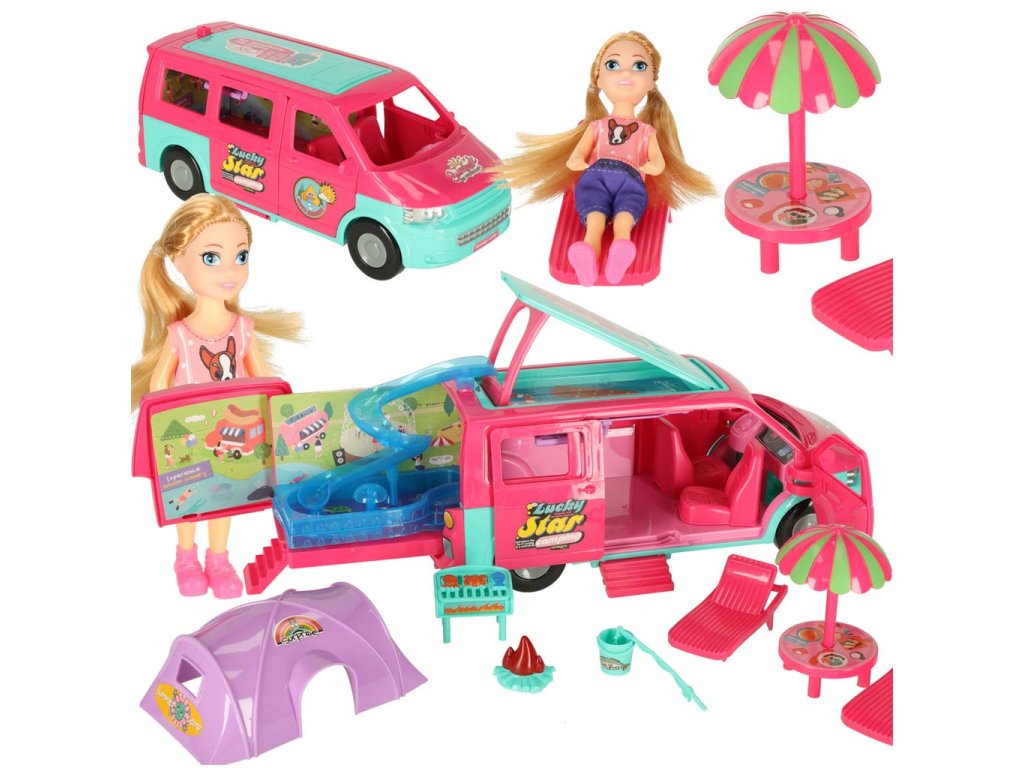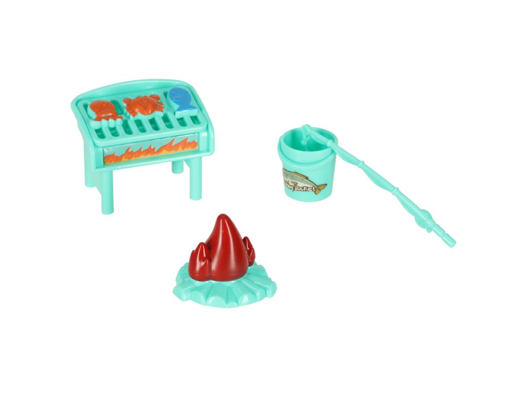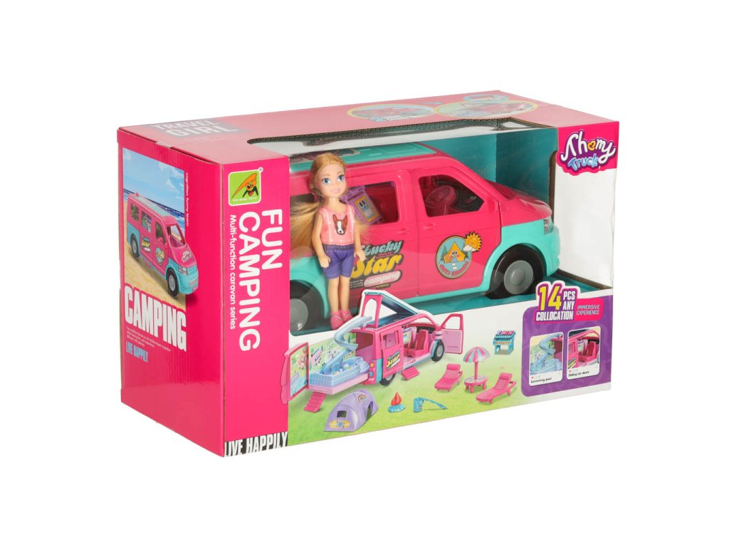 - Skládací karavan - slunečník- kulatý stůl- 2 x lehátko- bazén- skluzavka- gril- ohniště- kbelík- rybářský prut- stan- panenka- návod k použití Vlastnosti: - Otevírací dveře do karavanu- Výsuvný televizor- Zvedací střecha- Výsuvné schůdky
