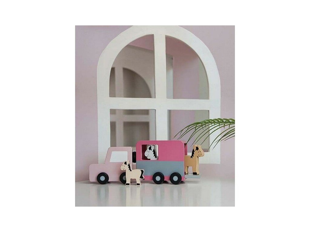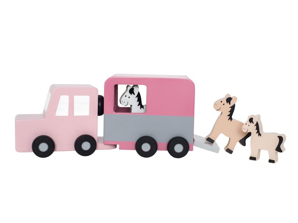 Zábavný přívěs pro koně se 3 koňmi v různých barvách. Odnímatelný přívěs umožňuje hrát si jen s ním. Podporuje nápaditou a kreativní hru dětí.