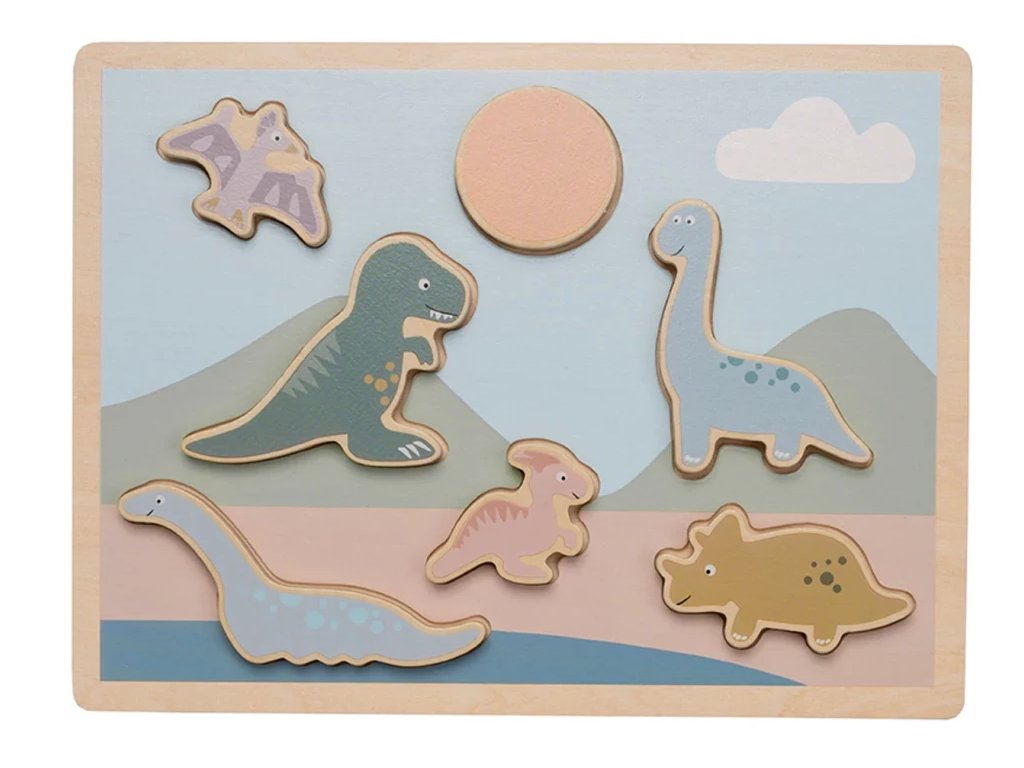 Dřevěné puzzle s dinosaury pro malé děti. Trénují jemnou motoriku a jsou bezpečné. Rozměry: 1,7 x 30 x 22,5 cm. Materiál: Materiál: překližka. Certifikováno podle evropských norem.