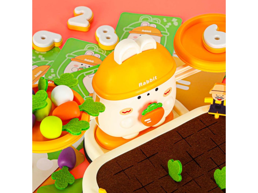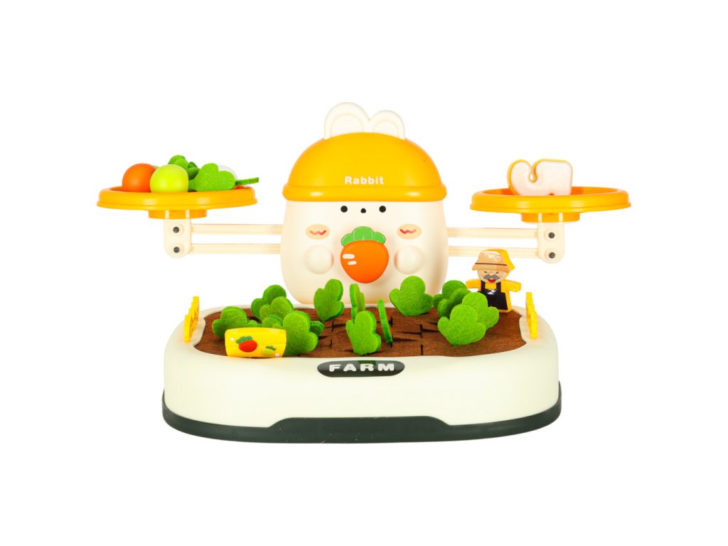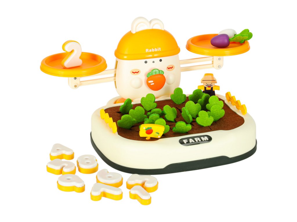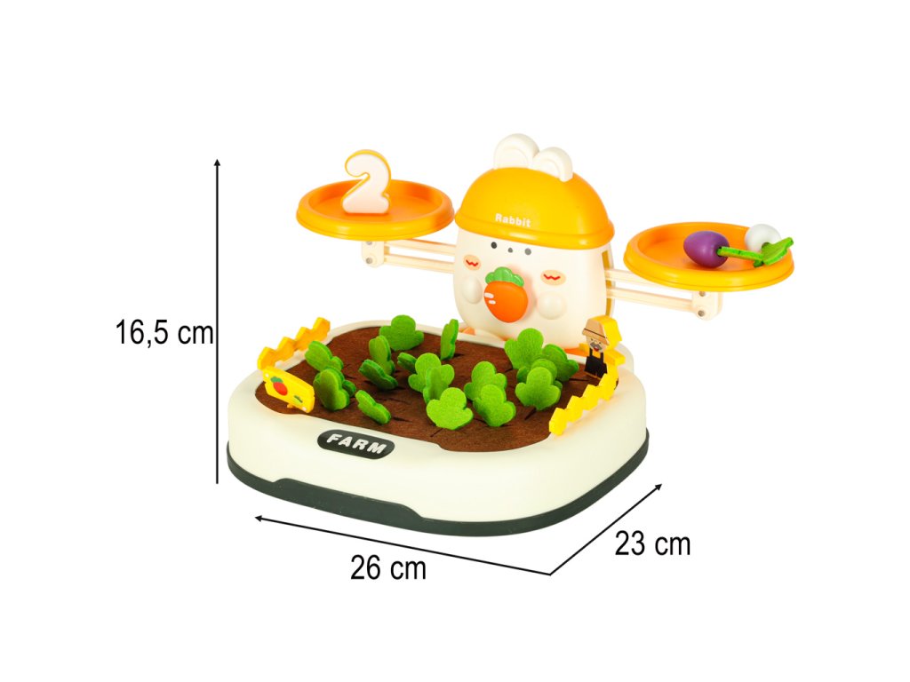 V horní části sady kraluje roztomilý králíček, který "hlídá" rovnováhu. Dítě může skládat mrkve nebo jiné předměty ve snaze udržet rovnováhu nebo ji záměrně narušit a zároveň se učí základům fyziky a logického myšlení. Sada je také vybavena speciálními čísly - každé číslo má odpovídající váhu k číslu, které představuje. Vaše batole tak může experimentovat, porovnávat váhy a učit se hodnoty čísel v praxi! Tato hra je skvělá pro podporu učení počítání a základních matematických pojmů.