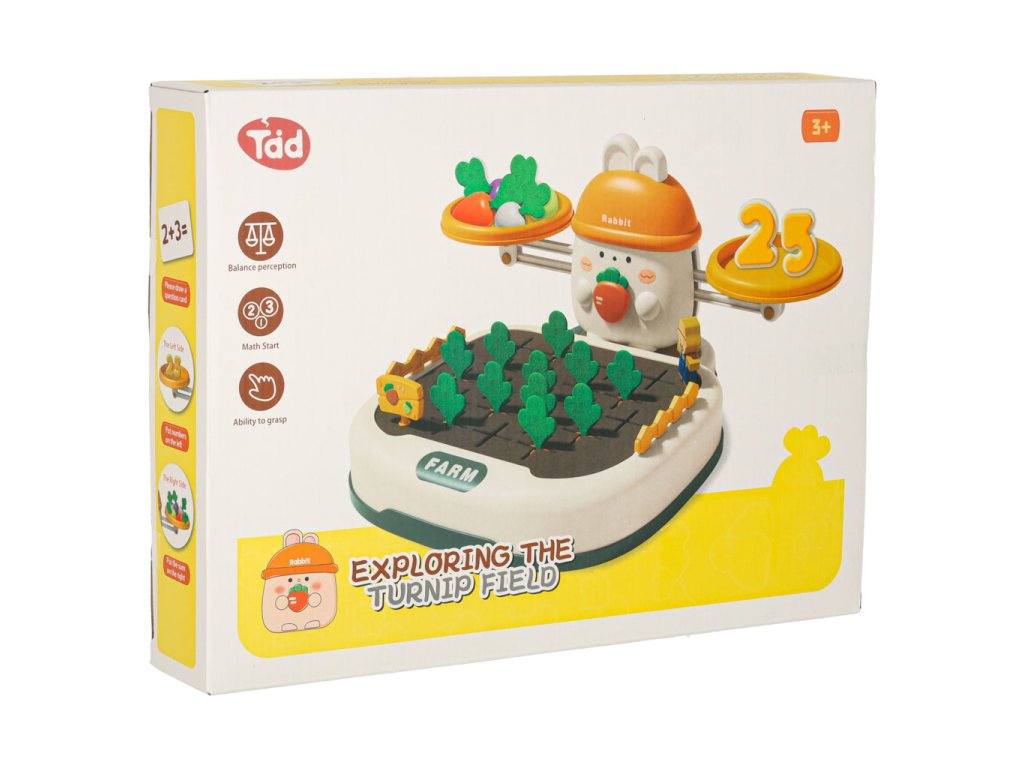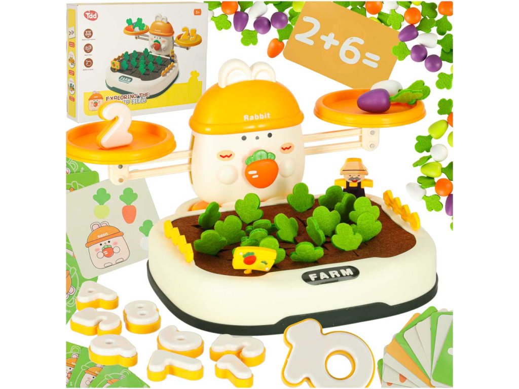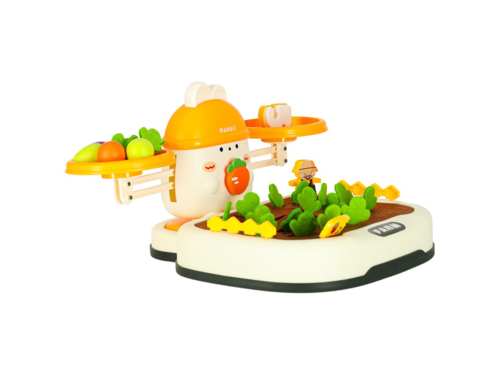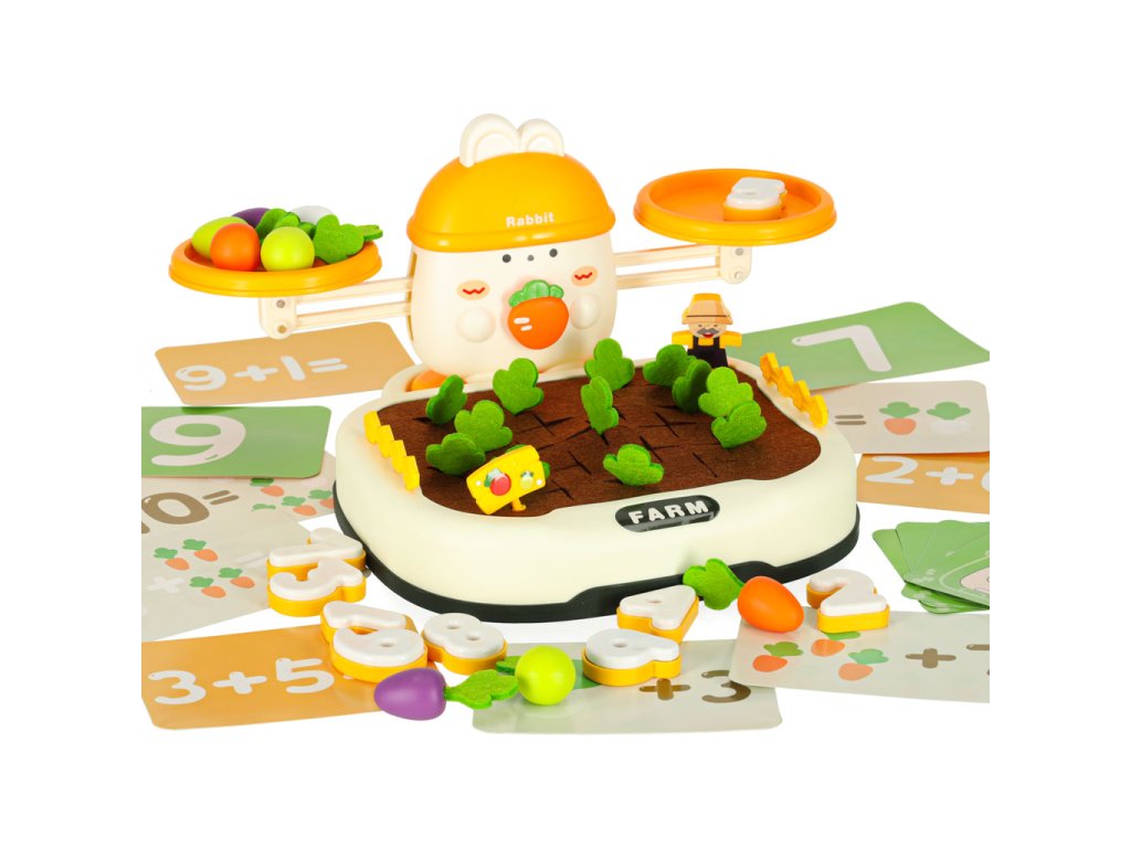 V horní části sady kraluje roztomilý králíček, který "hlídá" rovnováhu. Dítě může skládat mrkve nebo jiné předměty ve snaze udržet rovnováhu nebo ji záměrně narušit a zároveň se učí základům fyziky a logického myšlení. Sada je také vybavena speciálními čísly - každé číslo má odpovídající váhu k číslu, které představuje. Vaše batole tak může experimentovat, porovnávat váhy a učit se hodnoty čísel v praxi! Tato hra je skvělá pro podporu učení počítání a základních matematických pojmů.