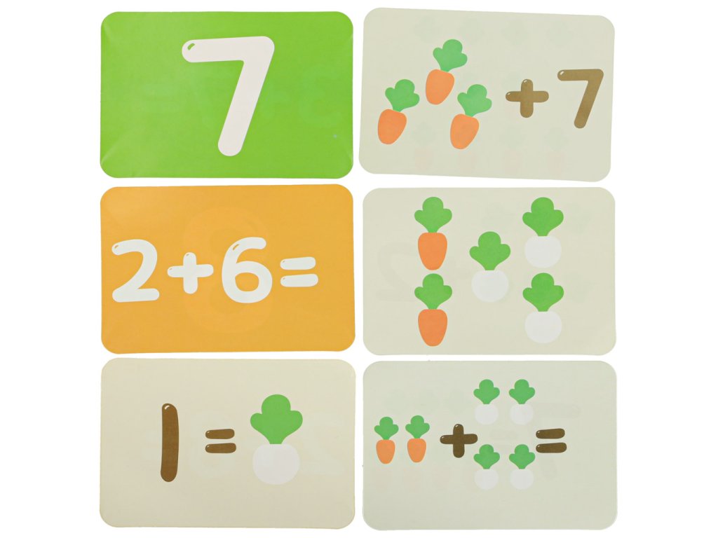 Vzdělávací prvky:- 10 čísel (každé s jinou váhou, která odpovídá číselné hodnotě)- 30 kartiček s čísly a mrkví (velikost: 9 × 12,5 cm)- 18 kartiček s uspořádáním mrkve (velikost: 9 × 9 cm)- 20 kousků zeleniny (např. mrkev), které se nacházejí na obrázku. 9,5 cm)- 2 talíře o průměru 9,5 cm- Tác s váhou (rozměry: 33 × 26 × 16,5 cm)- Tác s motivem plstěné farmy (rozměry: 23 × 26 × 4,5 cm)- 2 překážky- 1 strašák- 1 varovná cedule- Sada barevných samolepek- Návod k použití