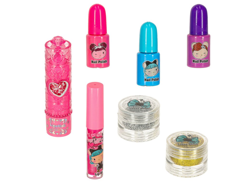 - 6x lesk na rty- 6x oční stíny- 6x rtěnka- 1x vestavěné zrcátko- 2x sypké třpytky- 1x oboustranný pilník na nehty- 13x samolepky na nehty- 1x rtěnka- 1x lesk na rty- 3x lak na nehty- 2x oddělovač barev na nehty- 3x štětce na make-up