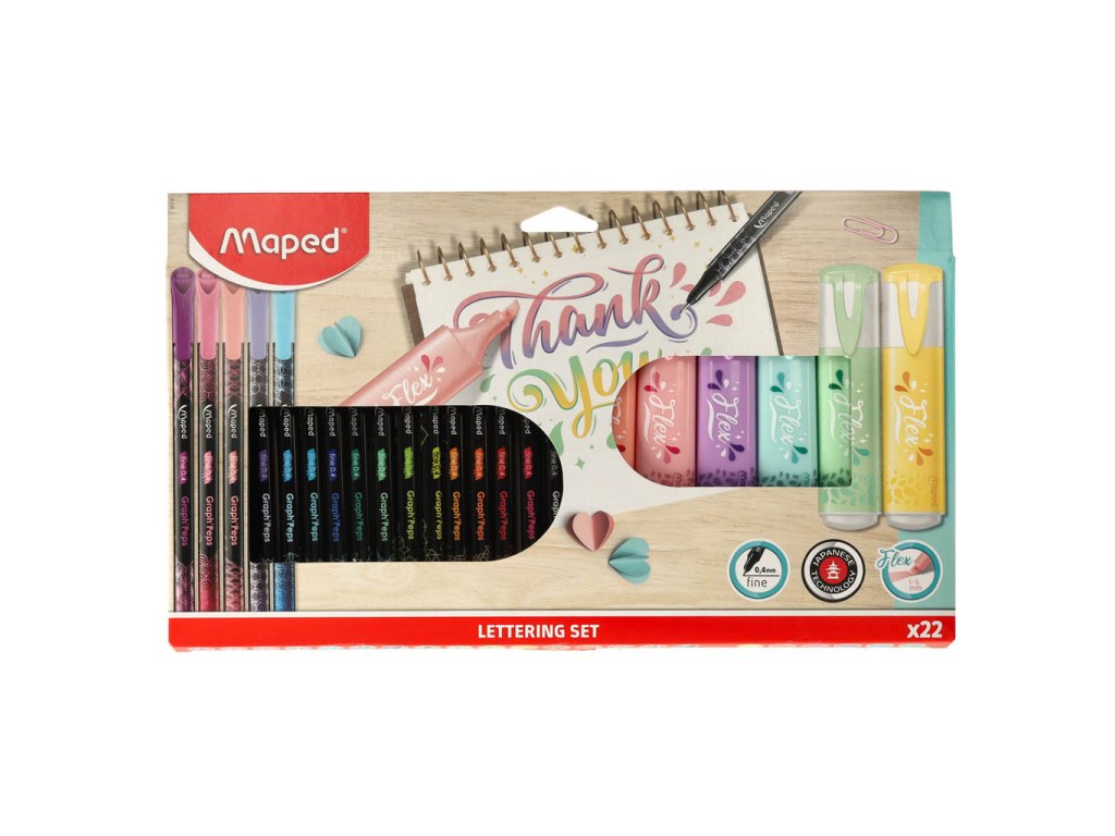 Sada 22 kusů popisovačů: 6 zvýrazňovačů Flex a 16 tenkých per Graph'Peps Deco. Zvýrazňovače Flex s měkkým hrotem, odolným inkoustem a zkráceným hrotem pro psaní silných i tenkých čar. Tenká pera Graph'Peps Deco s hrotem 0,4 mm, bezpečnostním uzávěrem a ergonomickým tvarem pro pohodlné psaní. Ideální dárek pro kreativní blízké!