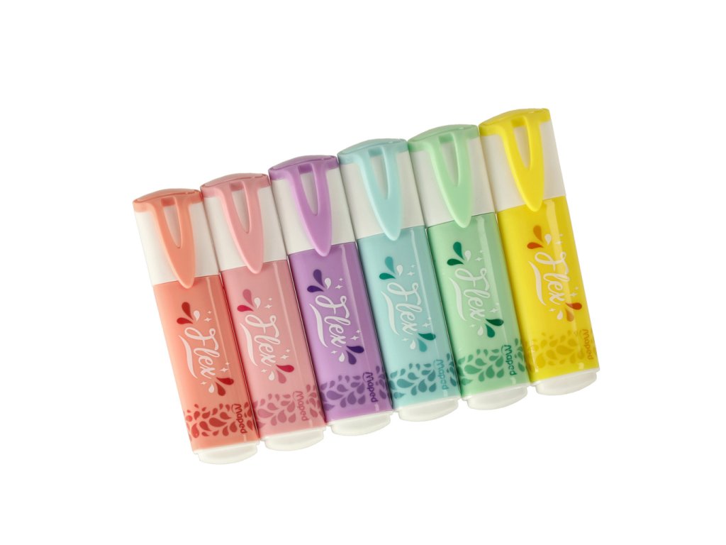 - Zvýrazňovače Flex Pastel - jedinečný měkký hrot vyrobený japonskou technologií dokonale přilne ke zvýrazňovanému povrchu, i když není dokonale rovný. Zdobené pouzdro klasického tvaru. Světlostálý, netoxický inkoust s vysokým výkonem a trvanlivostí. Pro všechny standardní, samopropisovací, fotokopírovací, termální a faxové papíry. Ponechané bez uzávěru neztrácí pero své vlastnosti ani po 4 hodinách. Zkrácený hrot umožňuje psát tenkou i silnou čáru od 1 do 5 mm.
