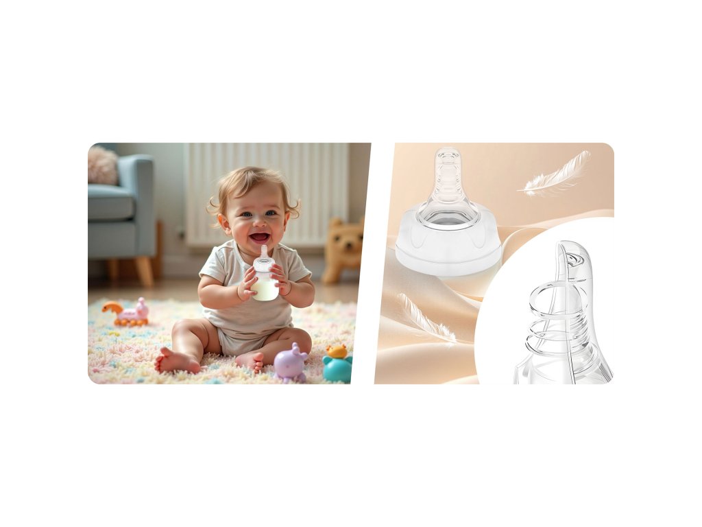 Naše láhve jsou vybaveny dynamickou savičkou. Je navržena tak, aby napodobovala mateřskou bradavku, a tím;usnadňuje účinnou extrakci a nezpůsobuje takzvaný konflikt s dudlíkem. Součásti dynamického dudlíku jsou navrženy tak, abyzměnily tvar během krmení, což stimuluje ústní svalstvo dítěte a umožňuje mu regulovat tok mléka v závislosti na sací síle. Tímto způsobem dítěneztrácí své přirozené reflexy a vývoj ústní dutiny je normální.