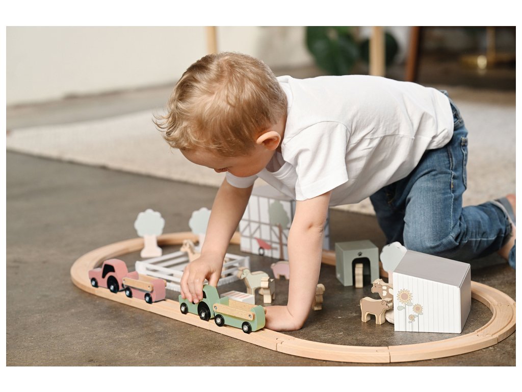 Je čas bojovat s ohněm! Klasické dřevěné kolejiště Jabadabado se záchrannými vozidly zahrnuje policejní stanici, hasičskou stanici a vězení. Postavte koleje dohromady a umístěte tři domky podél silnice, auta mohou projíždět policejní stanicí. Policejní auto a vrtulník pátrají po zlodějích, kteří zřejmě ukradli peníze! Když zloděje chytíte, odvezete je do vězení. Až honička skončí, bezpečně přistaňte s vrtulníkem na heliportu jednoho ze tří domů. Ale ne, kočka zřejmě vylezla na strom a nemůže slézt dolů. Pospěš si a jeď tam s hasičským autem, abys kočce pomohl opět dolů na zem. Smůla však nekončí, nyní se zdá, že vypukl požár. Hasičské auto je na cestě, aby ho uhasilo. Uf, konečně se zdá, že je ve městě klid a ticho. Teď mohou auta v klidu hlídkovat podél kolejí a čekat na nová dobrodružství. Malý vláček podporuje kreativní hru a zaručeně zabaví dítě na dlouhé hodiny. Lze kombinovat s garáží Jabadabado i s dalšími vláčkodráhami a autodráhami od Jabadabado a dalších známých značek na trhu.