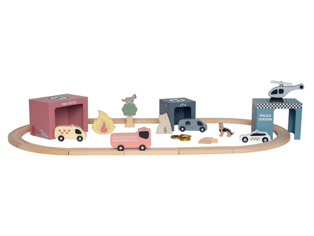 Obsahuje: 15 x dílky kolejí, 1x hasičské auto, 1x sanitka, 1x auto pro zloděje, 1x policejní auto, 1x vrtulník, 1x hasičská stanice, 1x policejní stanice, 1x vězení, 1x stromy, 1x kočka, 1x oheň, 1x látková taška na peníze, 1x policejní pes, 3 x mince v různých měnách