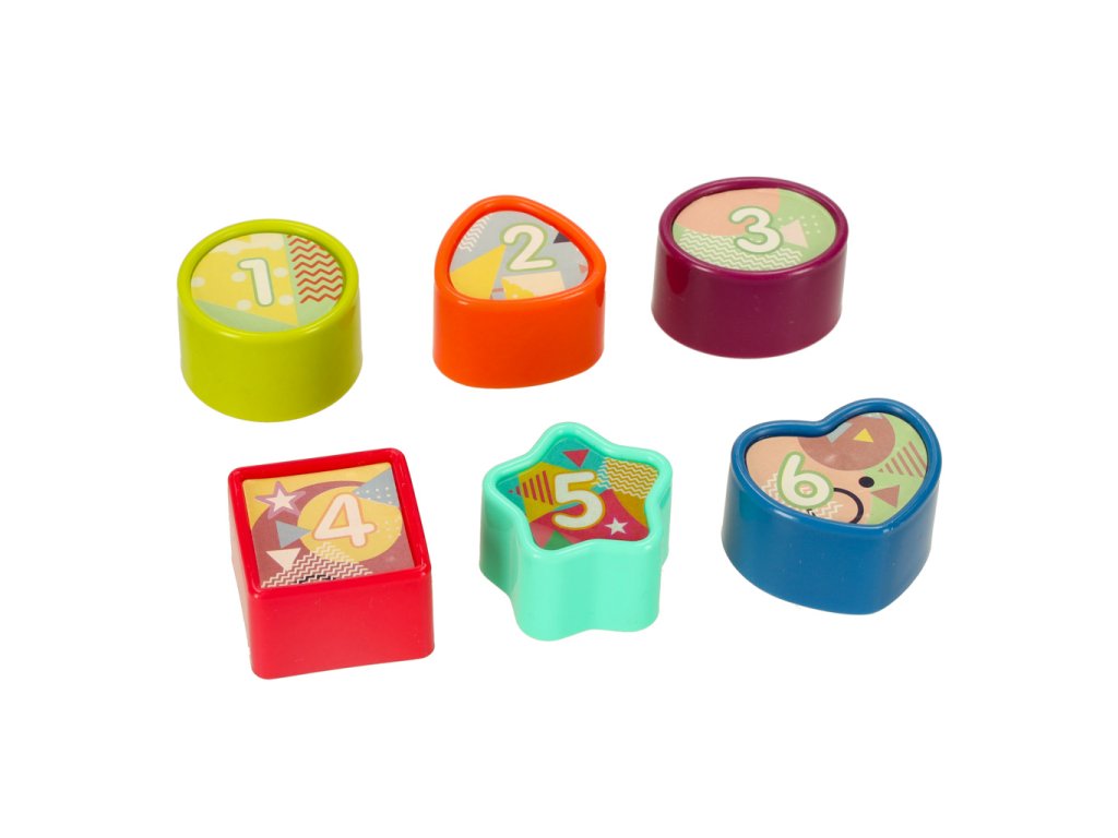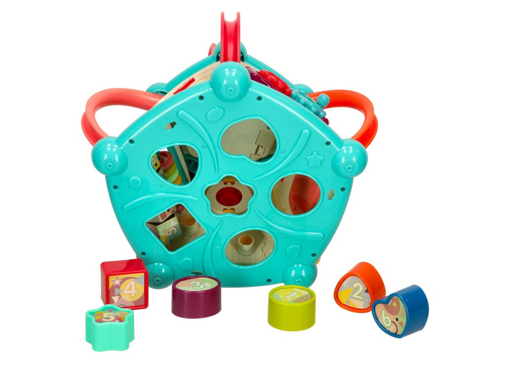 - Třídička tvarů a šest barevných kostek, které čekají na dokonalé přiřazení k tvarům. Je to skvělá zábava pro malé prstíky a rozvíjí kognitivní schopnosti a logické myšlení.