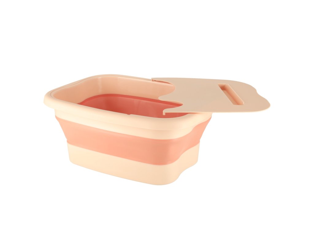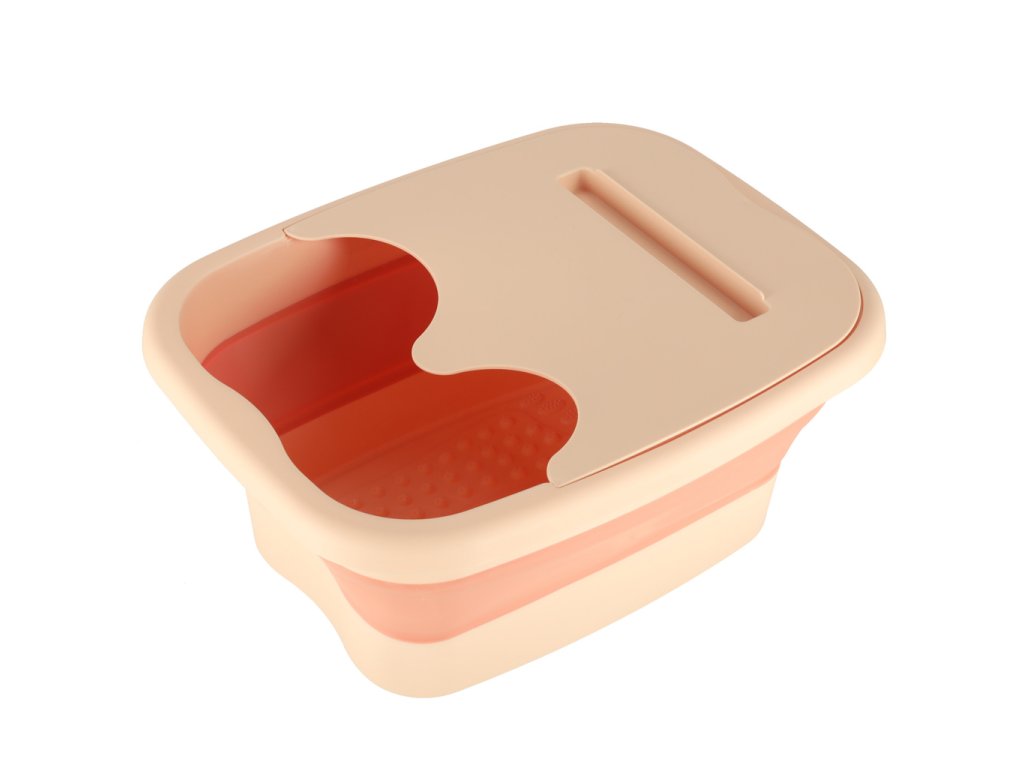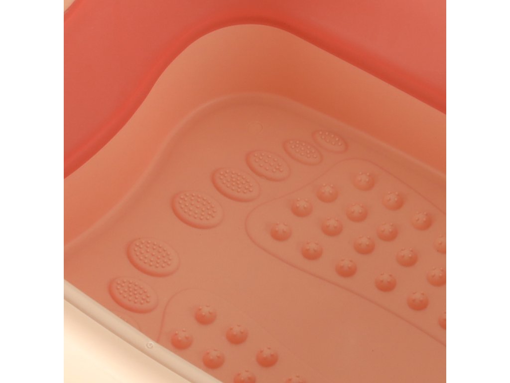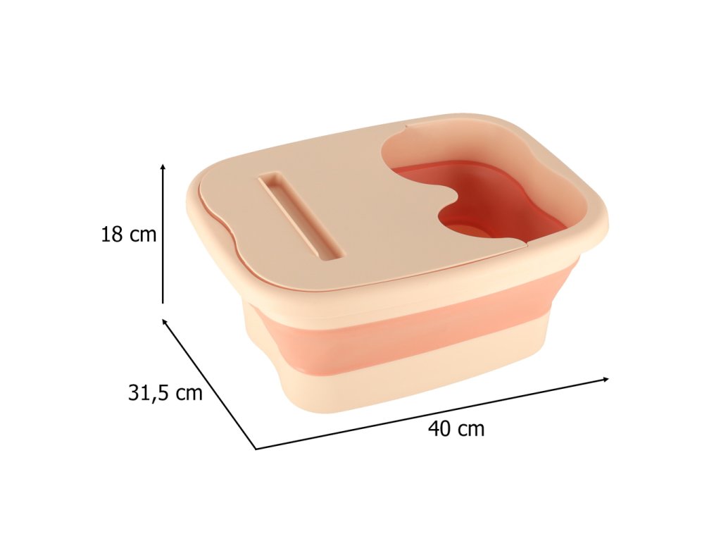 Masážní miska s masážními výstupky pro relaxaci. Objem 13 l, tělová a lososová barva, rozměry 39 x 29,5 x 31 x 18,5 cm. Skládací, tloušťka 6 cm, hmotnost 678 g. Včetně plastového obalu.