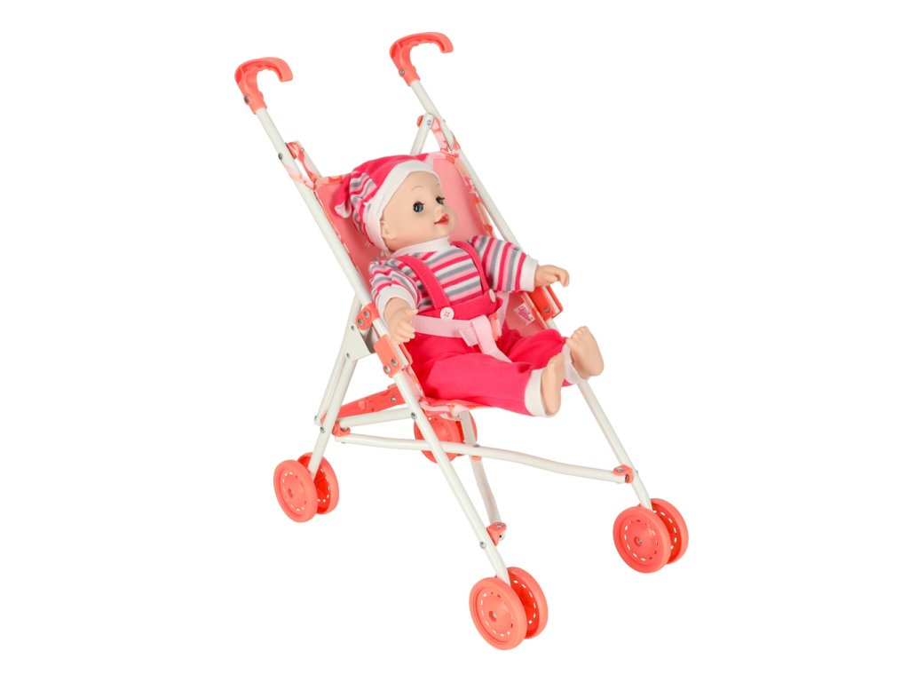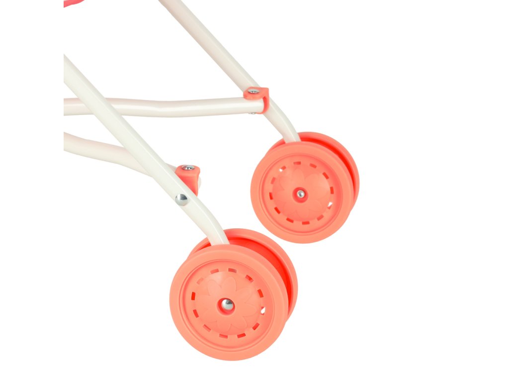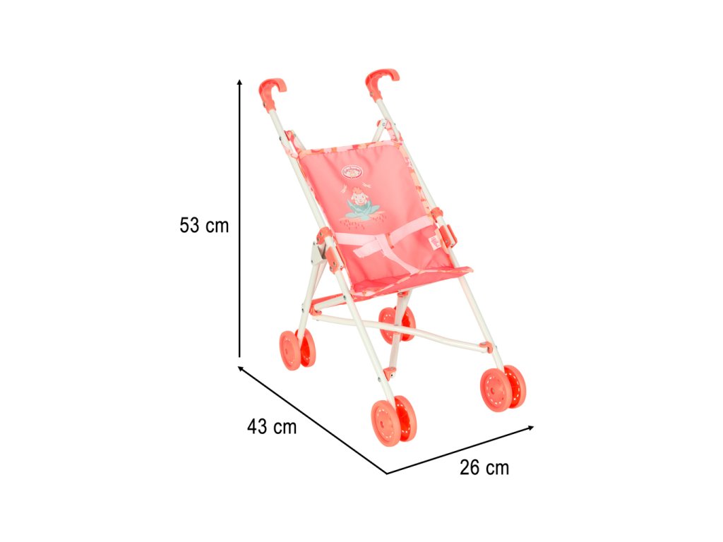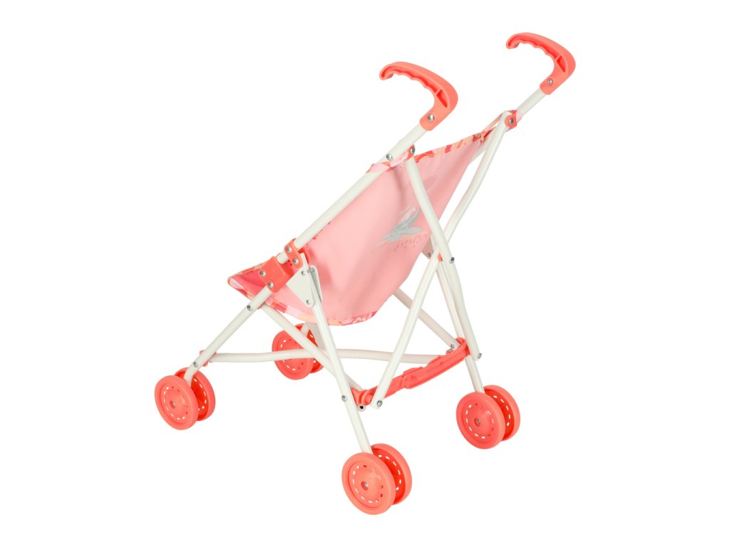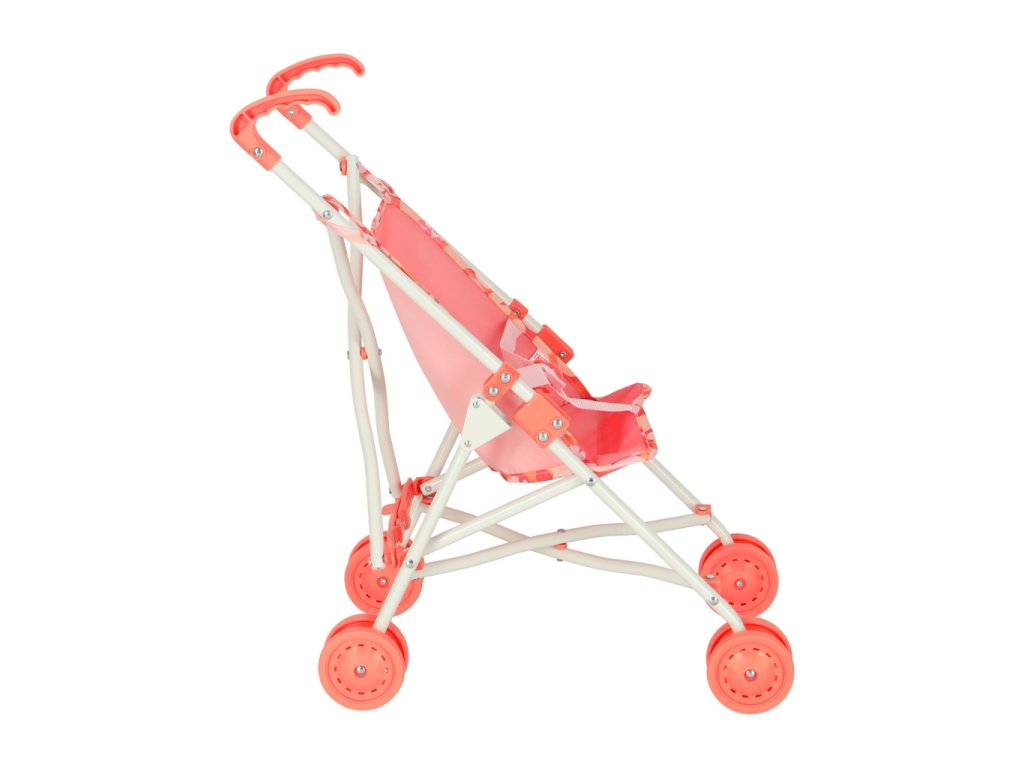 Kompaktní a lehký kočárek v růžové barvě s praktickými rozměry a velkými koly. Ideální společník pro pohodlné přenášení nákupů nebo věcí.