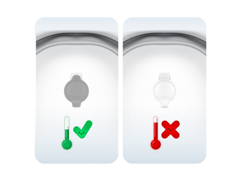 Pokud teplota vody překročí 38 °C, barva korku se změní z šedé na bílou.