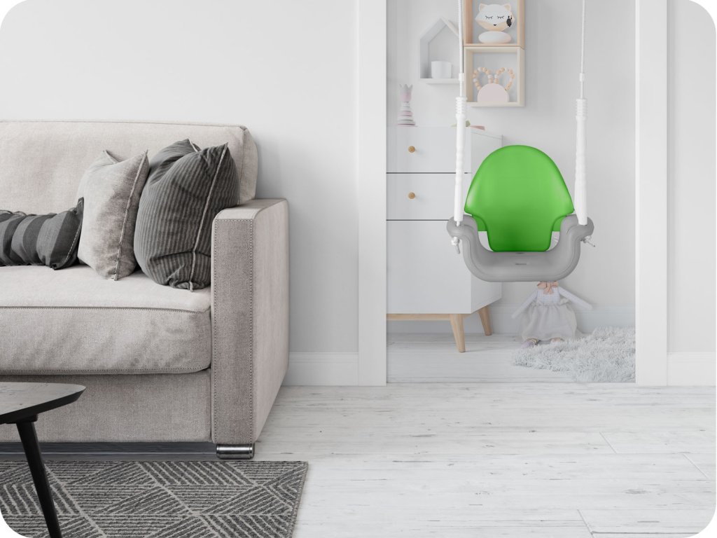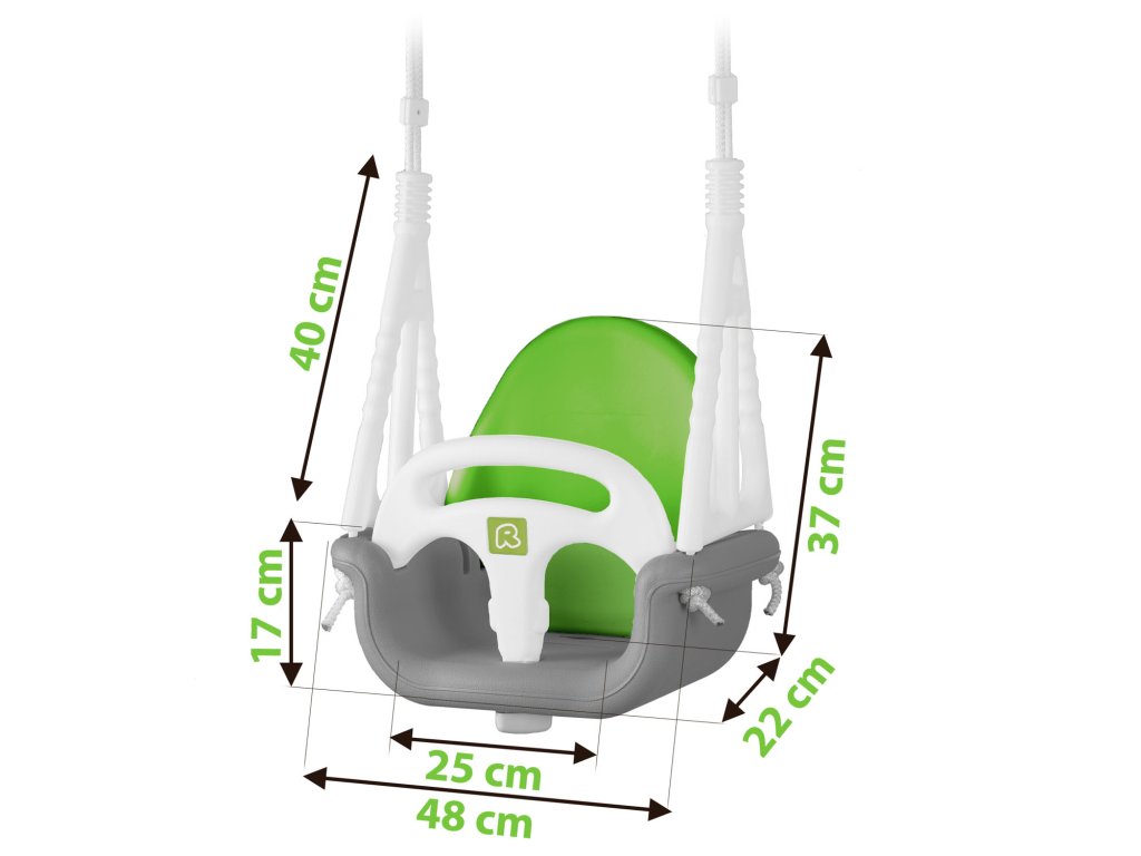 - pevná lana délka až 130 cm, nastavitelná pomocí kovových svorek, lana jsou navíc chráněna speciálními plasty, které chrání ruce dítěte před možným odřením a zvyšují stabilitu při houpání
