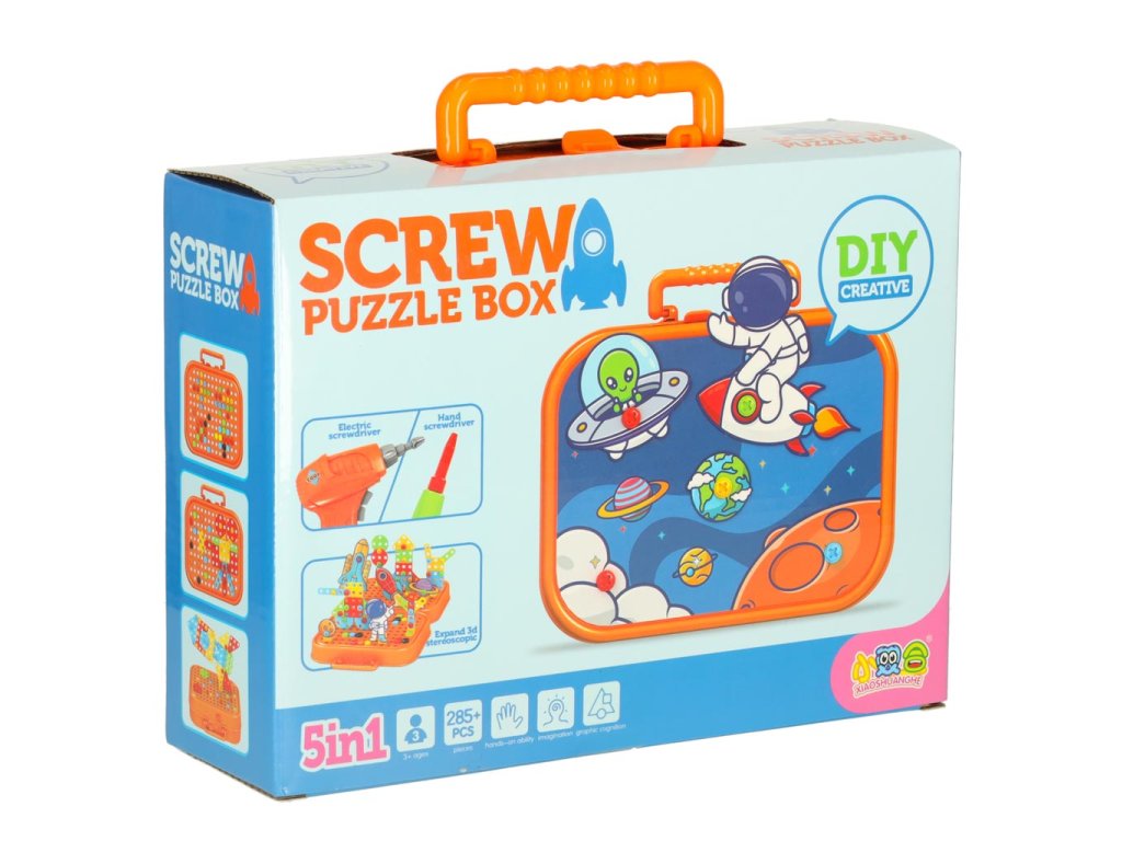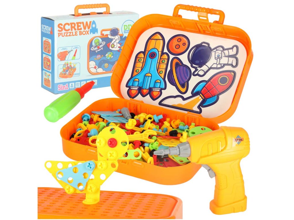 Kreativní sada se šroubovákem a 285 dílky, určená pro děti od 3 let. Obsahuje šroubovák, klíč, šrouby, cihly, bity, nástrčné hlavice, spojovací materiál, dekorace a inspirační kartu. Baterie nejsou součástí balení. Ideální dárek pro malé kutily.