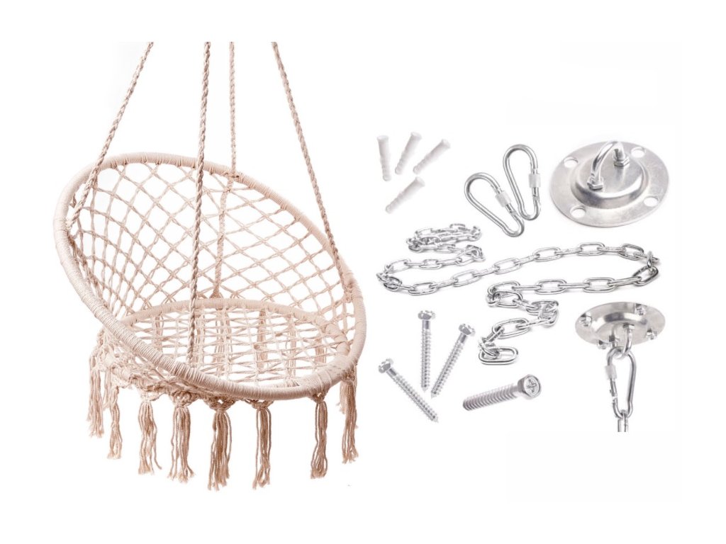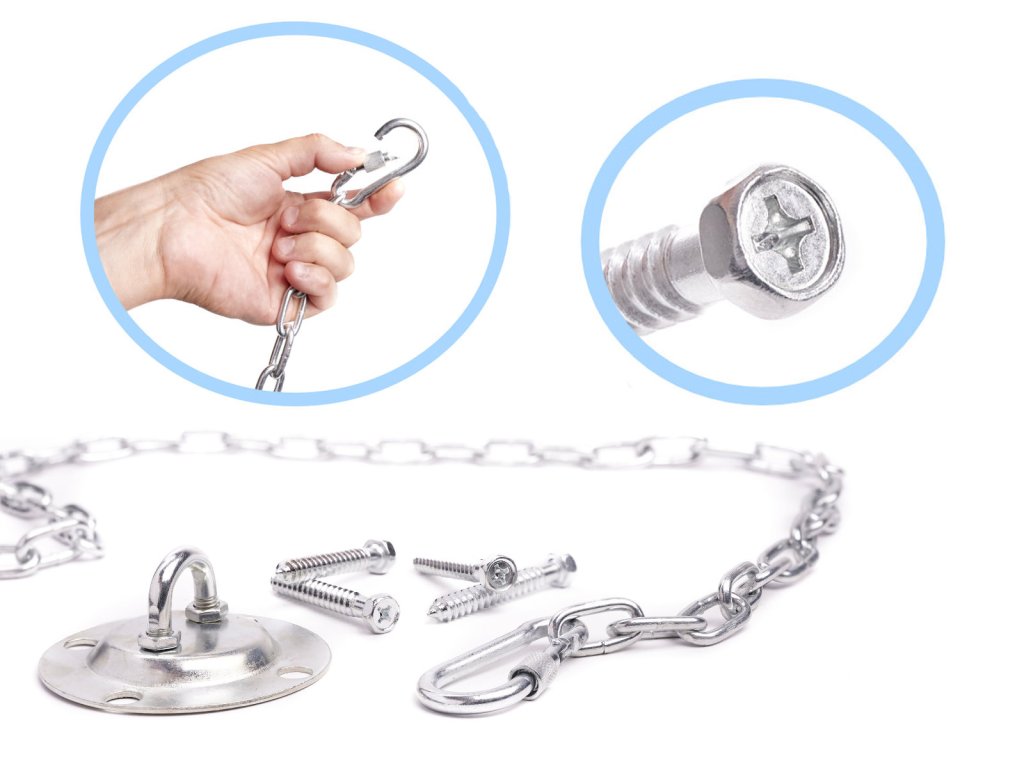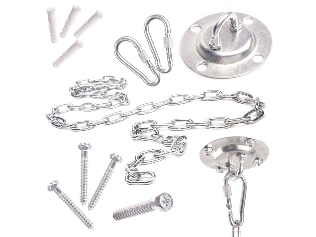Sada kovového stropního háku a řetězu pro montáž brazilských houpacích sítí a houpaček.