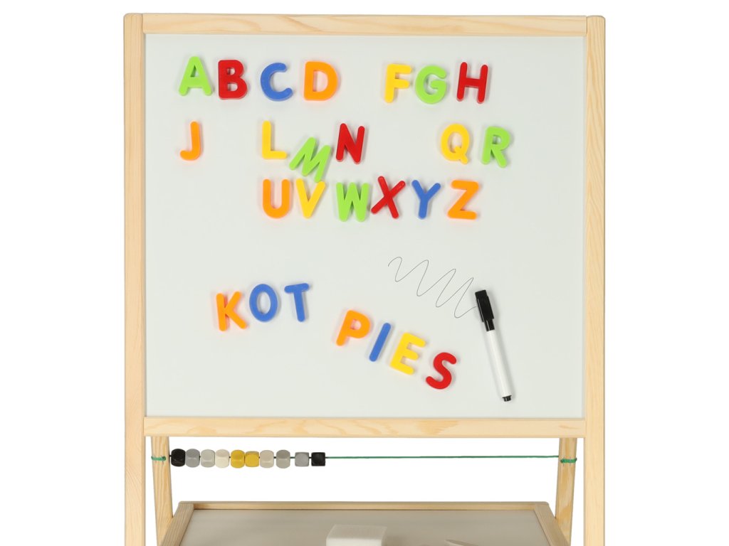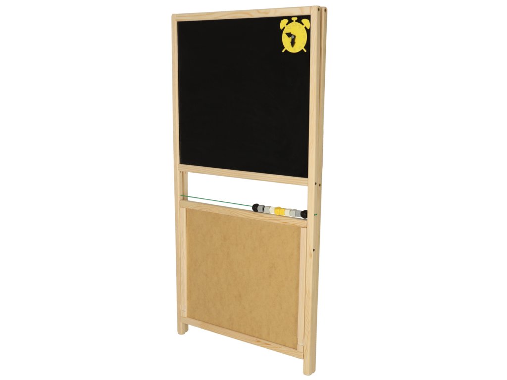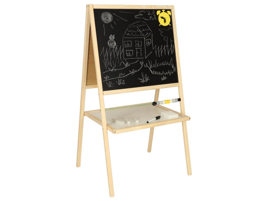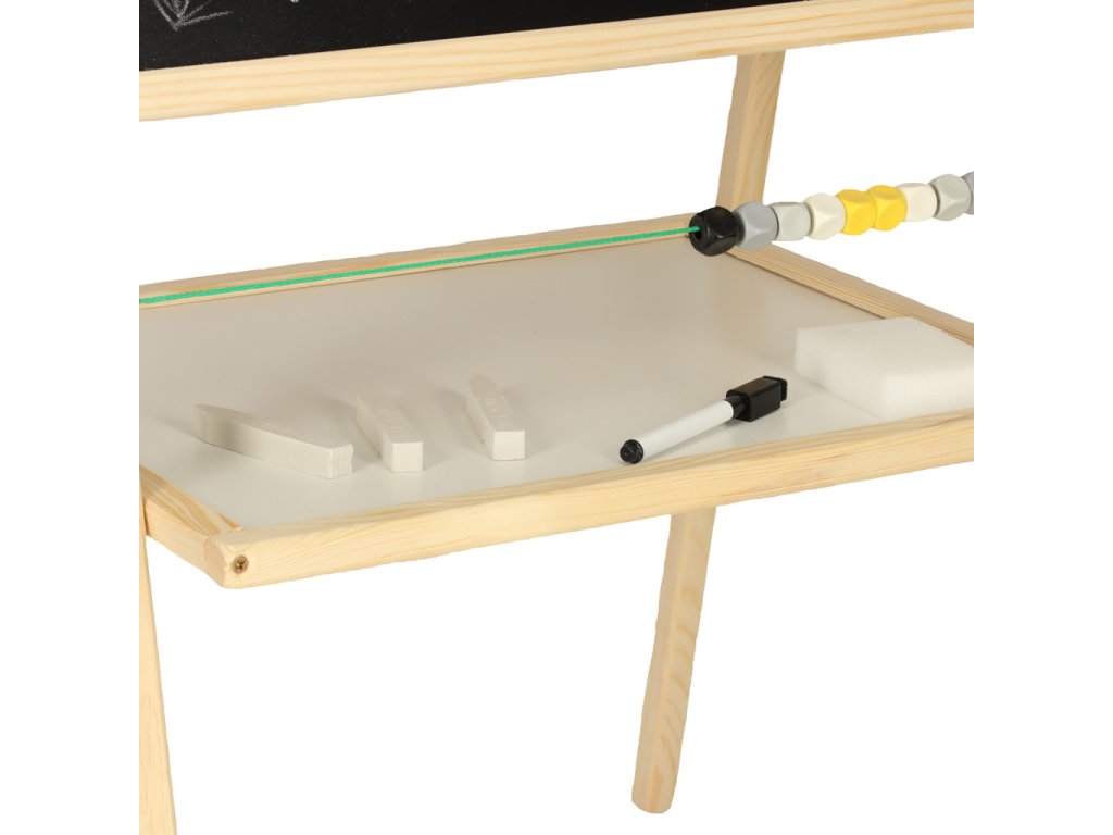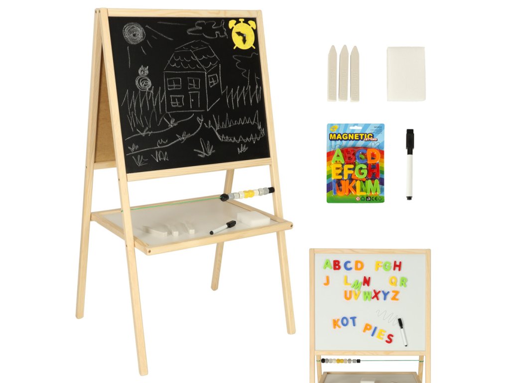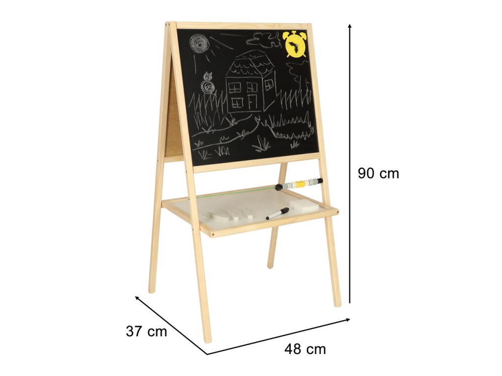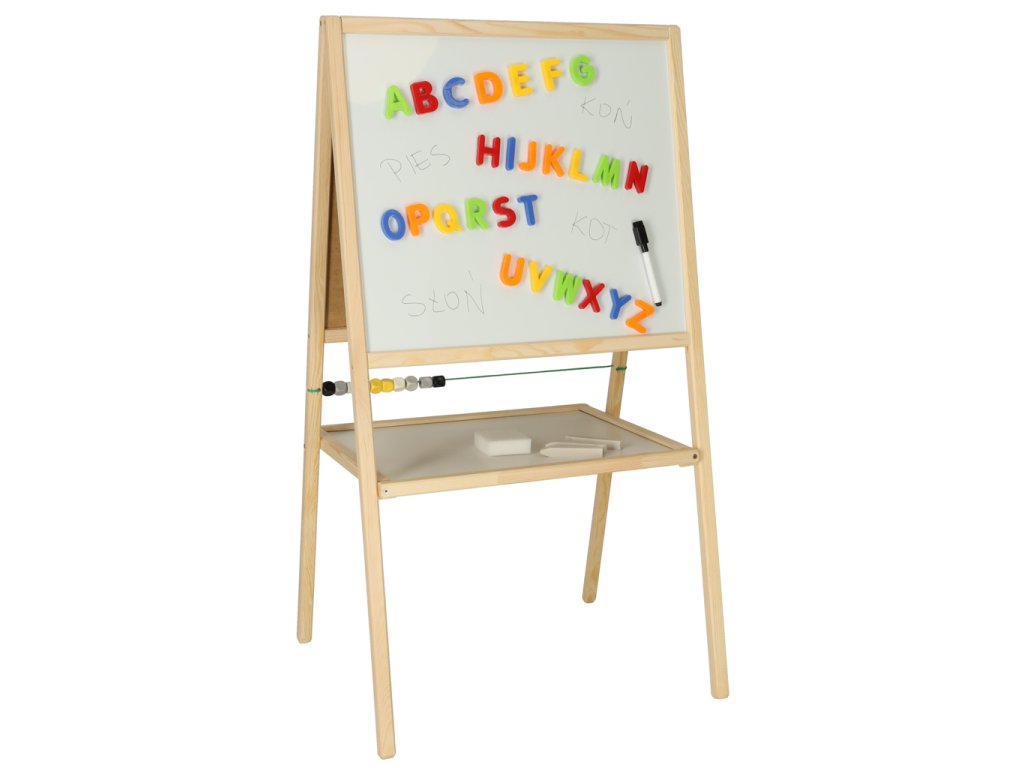 Dřevěná výuková tabule o rozměrech 37 x 48 x 90 cm je produkt, který kombinuje funkci křídové tabule a tabule s magnety podporovat rozvoj gramotnosti a matematické gramotnosti. Tabule má poličku na příslušenství a sada příslušenství: tři křídy, fix, gumovou houbu a magnety na písmena.