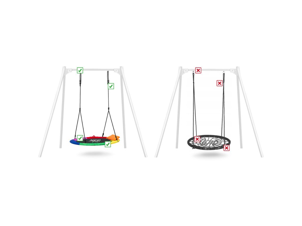Houpačka s ocelovým rámem potažené měkkou ochrannou pěnou, vyrobené z pevného materiálu s několikanásobným prošitím a na silných závěsných lanech. Zaručuje bezpečnost, stabilitu a odolnost.